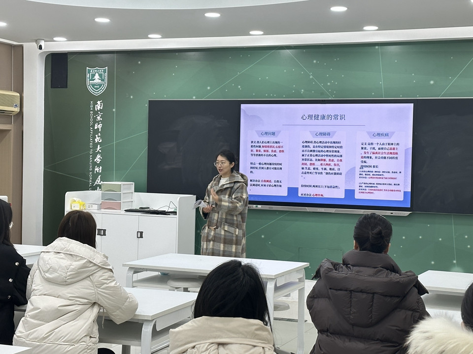 吴老师首先阐述心理健康的重要性,心理健康是指一个人在心理和情感上的良好状态,它直接影响到我们的思维、情绪、行为和身体健康。关注和维护我们的心理健康对于应对工作压力和增强个人韧性是至关重要的。接着,吴老师讲述了我们常见的焦虑情绪,焦虑也分成有益的焦虑和有害的焦虑,有益的焦虑有助于我们应对生活的挑战,而有害的焦虑会给我们增加生活的压力,增加自我觉察,及时用合适的方法来关怀自己。最后吴老师介绍了三个自我调适的方法:认知调整、自我关怀和正念疗法,让老师们在生活中学会自我调节、自我放松,这是非常必要的,也是完全能够做到的。
