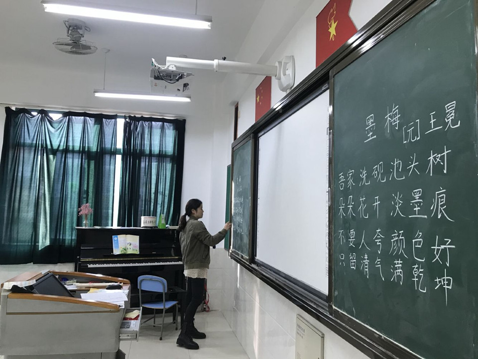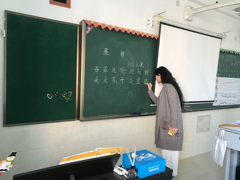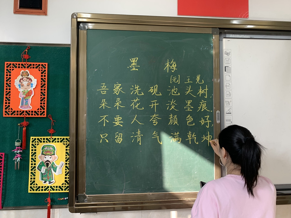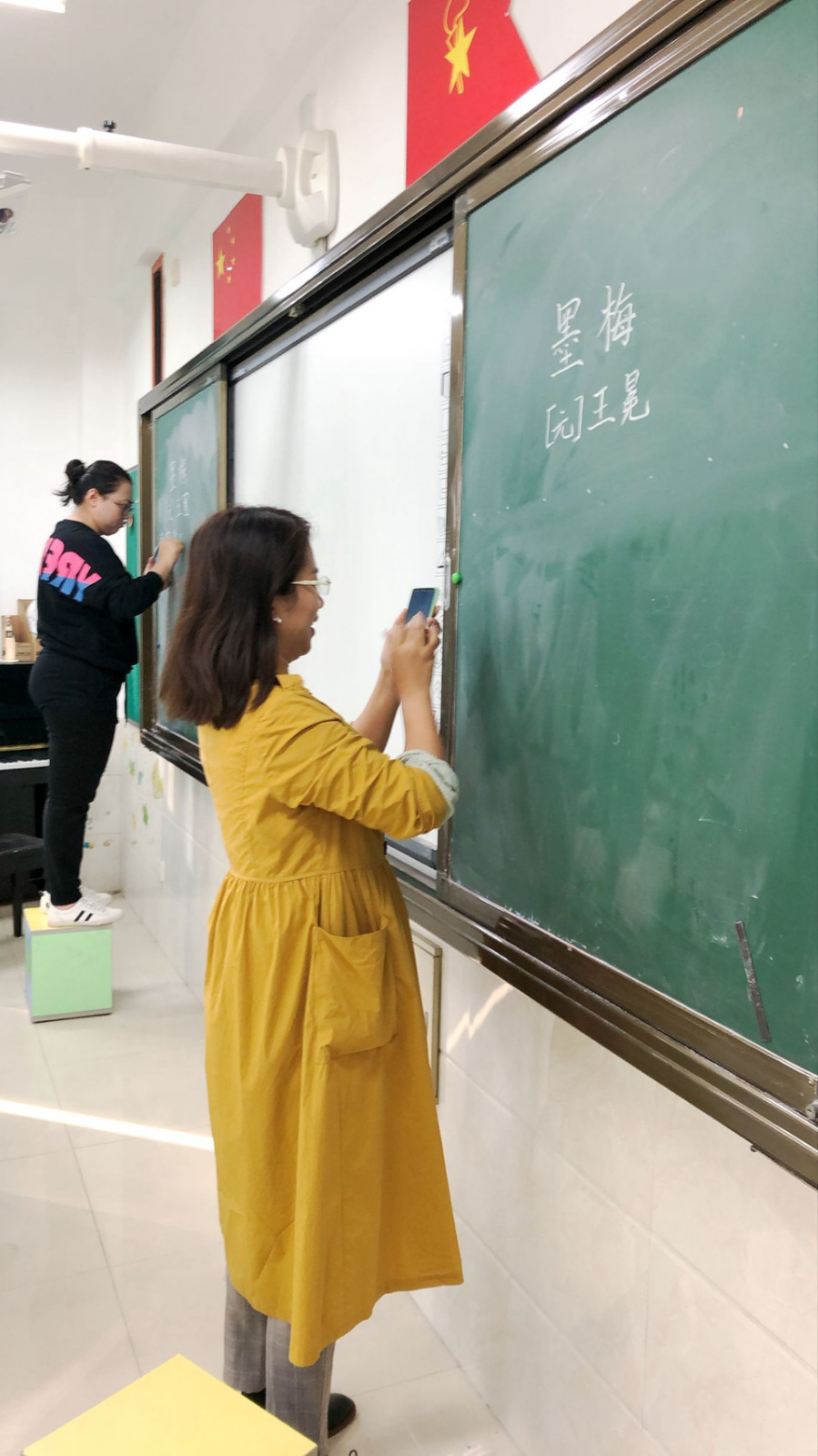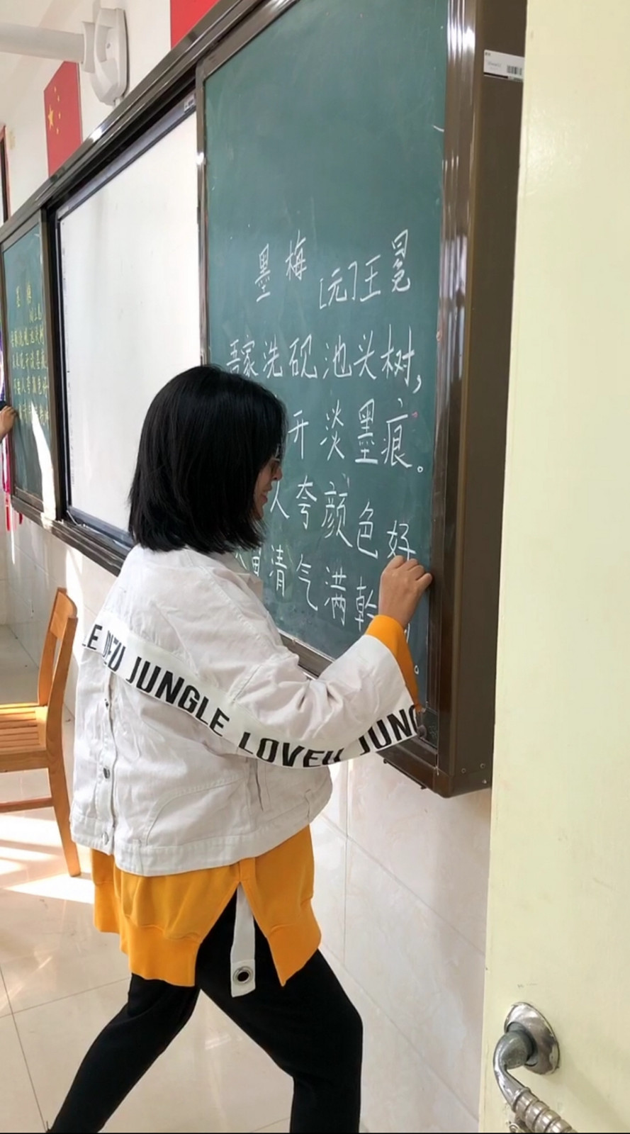 基于公平公正原则,林丽霜组长带领组员进行组内抽签,将教室黑板分配给各位老师使用。今天的比赛内容为书写王冕的《墨梅》,老师拿到题目后,立即进入所抽到的教室黑板上书写。在或撇或捺中,都能看出每位老师对于此次比赛的重视,精心创作心中的那一片芳华!