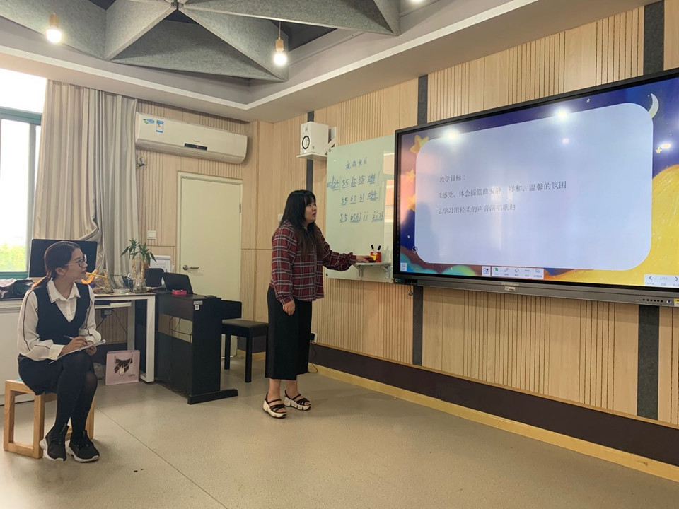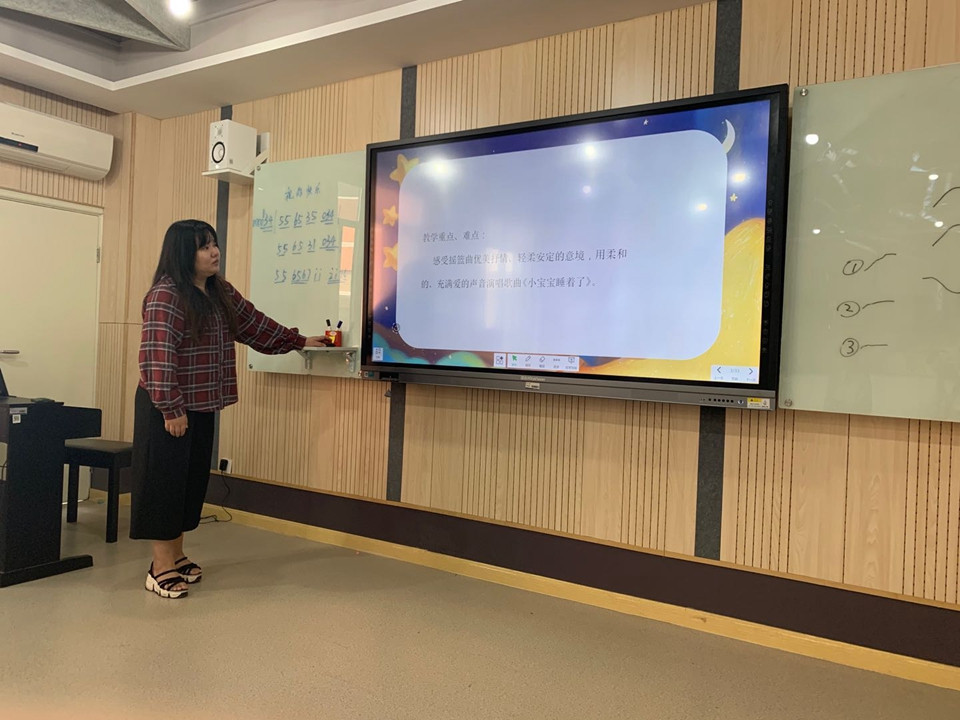 新学期的第三周的星期五上午第一节课,音乐组积极开展了第四次集体备课活动,本次集体备课的是教研组组长厉琳煜老师,授课班级为二年级1班,内容是《小宝宝睡着了》。教师出示图片,让学生观察图片内容,提问学生:“图中的小宝宝怎么了?”学生自主回答,并谈论自己小时候哭闹的时候父母是如何安抚自己的导入今天的课题,听赏完音乐之后通过提问学生歌曲速度,力度,音色,节奏,情绪,旋律等让学生进一步感知音乐,然后介绍摇篮曲,让学生划出旋律线,并作出科尔文手势,学唱会歌曲旋律歌词之后介绍木琴,用木琴参与歌曲伴奏,并作出律动。最后拓展欣赏舒伯特的《摇篮曲》,总结摇篮曲这一类型歌曲的特点,整节课充满温馨的气息。接着,老师们还针对这节课中三拍子的问题进行了积极的讨论,突破教学重难点,为下周的新课教学打开了思路。