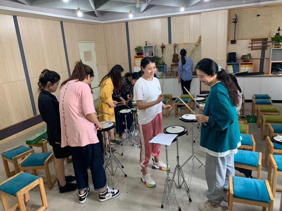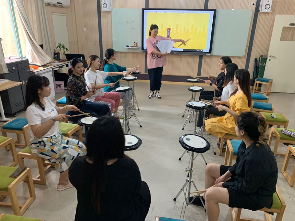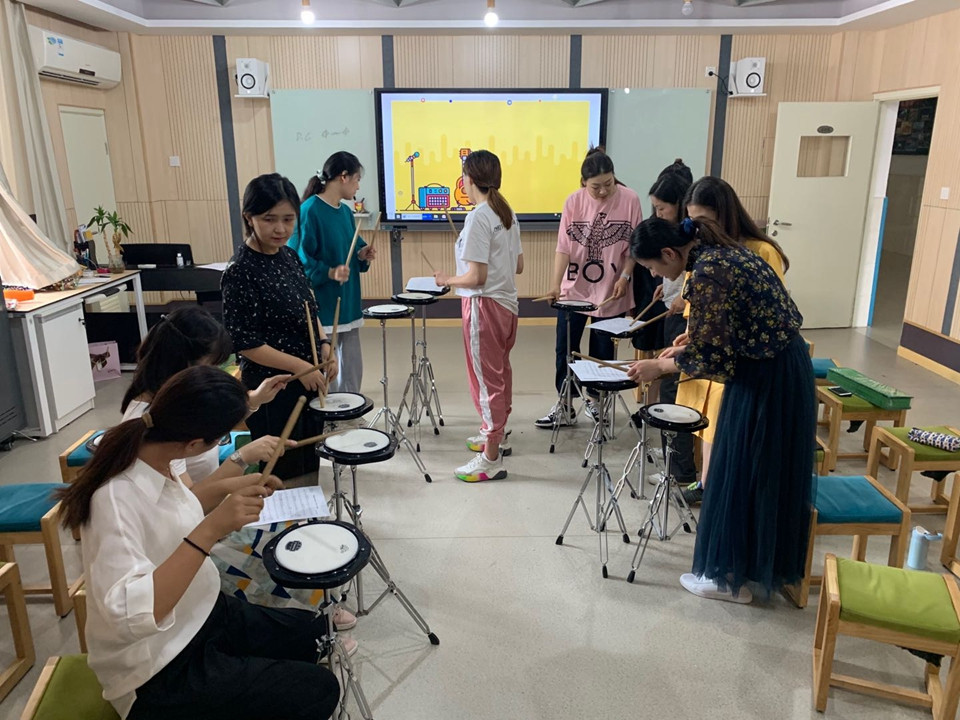 进入新学期的第四周,音乐组积极开展了第四次教研活动,本次教研活动的主题是打击乐培训,继续由打击乐专业的孙畅老师担任培训。首先,孙老师分配了四个声部,每个声部由3名老师完成演奏,并给每个声部分发了谱子,挨个给各声部的老师做了演奏示范,讲解了重难点之后让老师们分声部训练,最后四个声部一起合奏,在合奏中发现只要有一个老师出现错误听上去就会很混乱,所以还是要从慢速开始,老师们纷纷制定练习计划,相信打熟练之后再慢慢加速直到每个声部都能做到准确无误,期待老师们成功合奏联排的那一天快点到来!