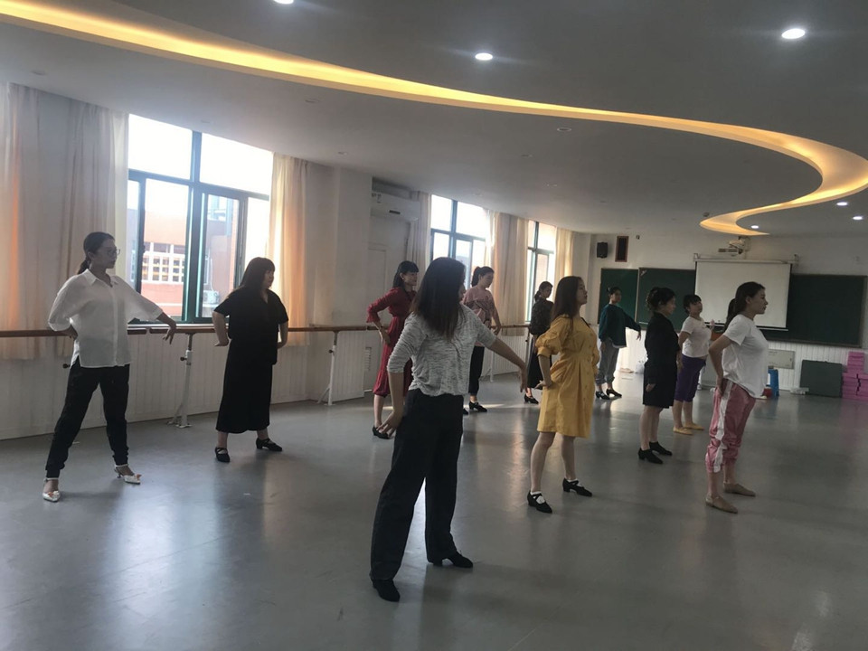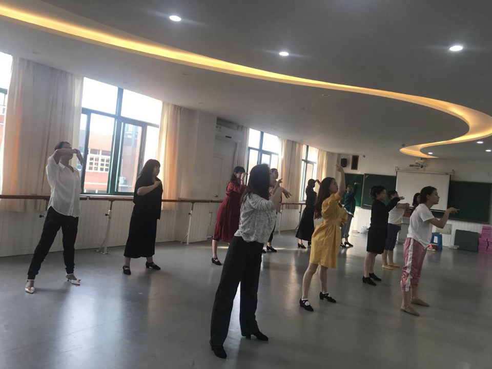 进入新学期的第四周,音乐组积极开展了第五次集体备课活动,本次集体备课的主题是舞蹈培训,由舞蹈专业的王媛老师担任培训老师,音乐备课组长林丽霜老师提前为老师们预备了舞蹈鞋,便于大家培训使用。通过二十分钟的基本功热身训练之后,大家身体都稍微打开了,之后进入正式教学,本学期王媛老师教授的舞蹈是古风舞《醉太平》,风格跟大家比较熟悉的《丽人行》很接近。通过一一讲解手部动作,头部动作,腿部动作,胯部动作等分别指导大家练习,大家学习的都很认真,但也发现平时还是比较缺乏这类锻炼,有些动作比如压腿以类的都有点心有余而力不足,后期还需要多加练习,相信在今后的培训中大家一定会更加进步!
