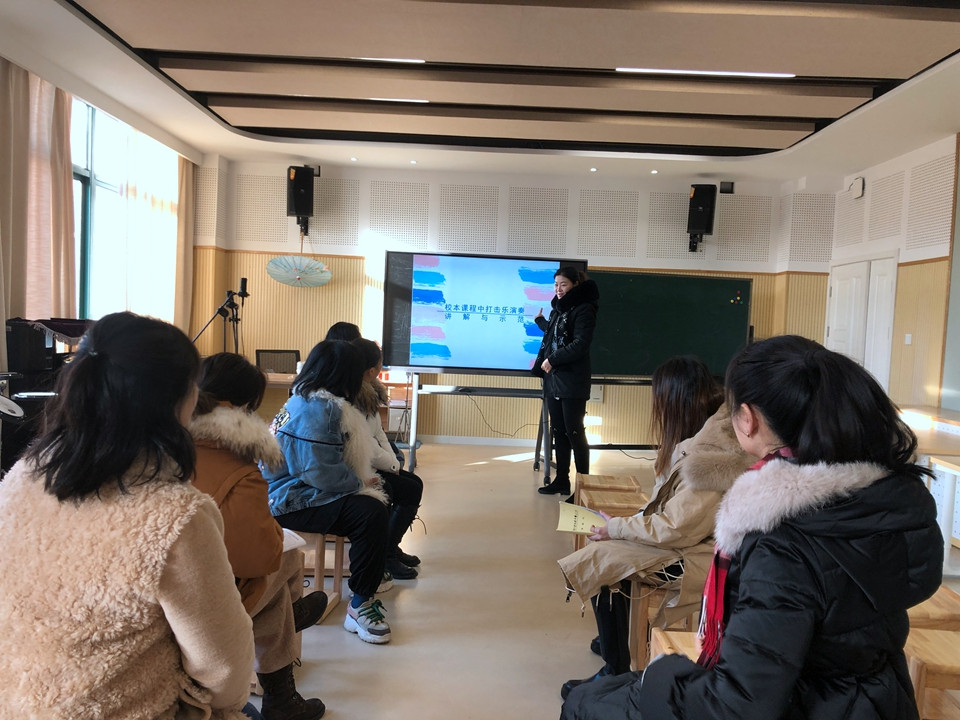 接下来,音乐组开展打击乐的讲座,由音乐组孙畅老师主讲。孙老师先从打击乐基本功开始,介绍打击乐器和打击乐知识,鉴于新老师对于基本功不太熟悉的情况,孙老师还耐心地进行单独指导。孙畅老师的讲座让参加培训的老师们有了新的认识,反响热烈,老师们表示希望今后多一些这样的专业讲座,以不断提高自身的音乐素养。