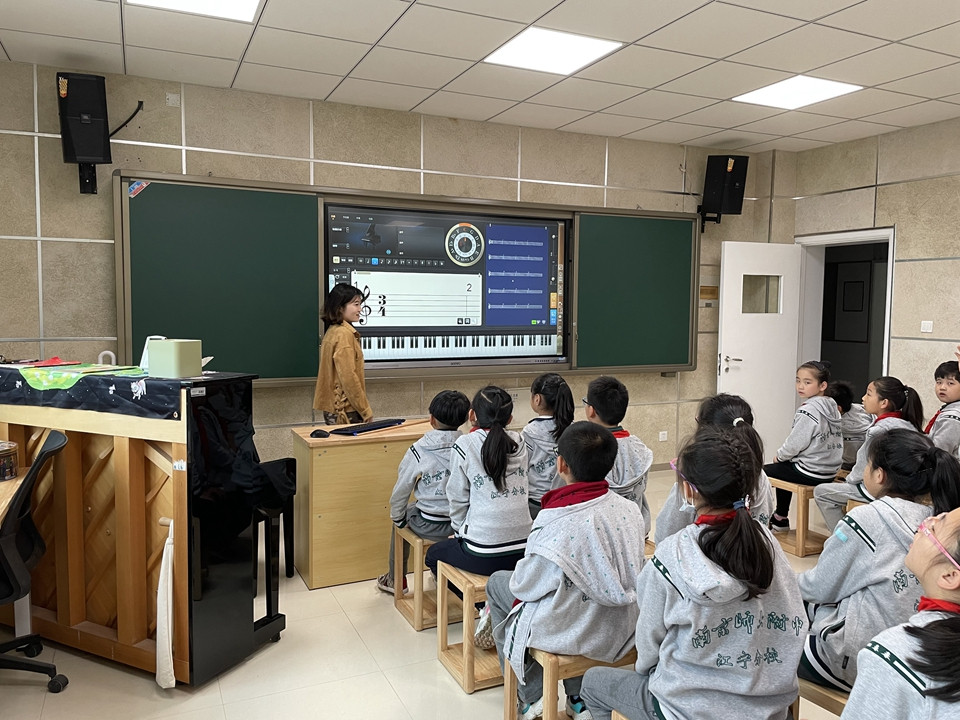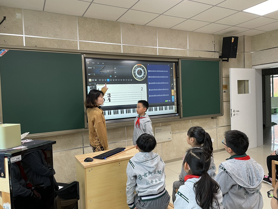 今天的教研活动中,施老师运用的这款“七彩旋律”软件,它是一款交互式音乐教学触摸一体机专用软件,集合五线谱乐理教学、简谱乐理教学、乐曲教学为一体,用科技重新定义音乐教学,将视觉与听觉进行同步教学体验。