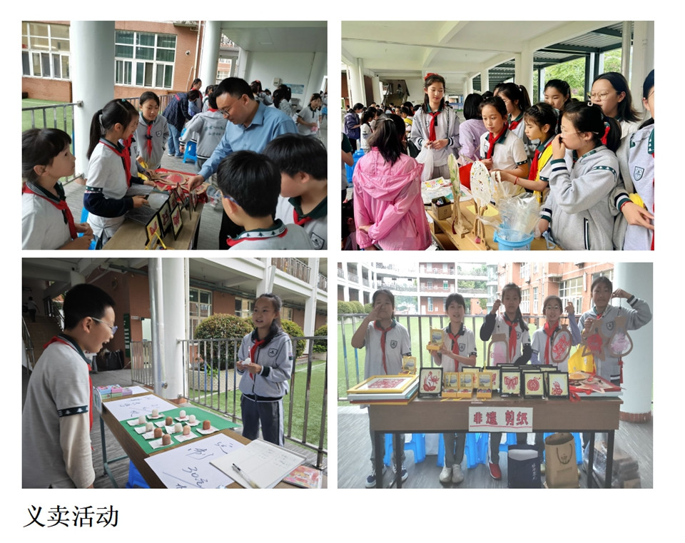 第二大项,“创意集市”义卖活动。小学生们将自己美术课上做的装饰瓶、剪纸、漆扇、编制手串、刺绣荷包、国画扇子等手工和绘画作品摆出来义卖,交易场面火爆,作品深受师生的喜爱,活动锻炼了孩子们的情商和财商,展示了学生美术素养,传递了快乐,培养了公益之心。