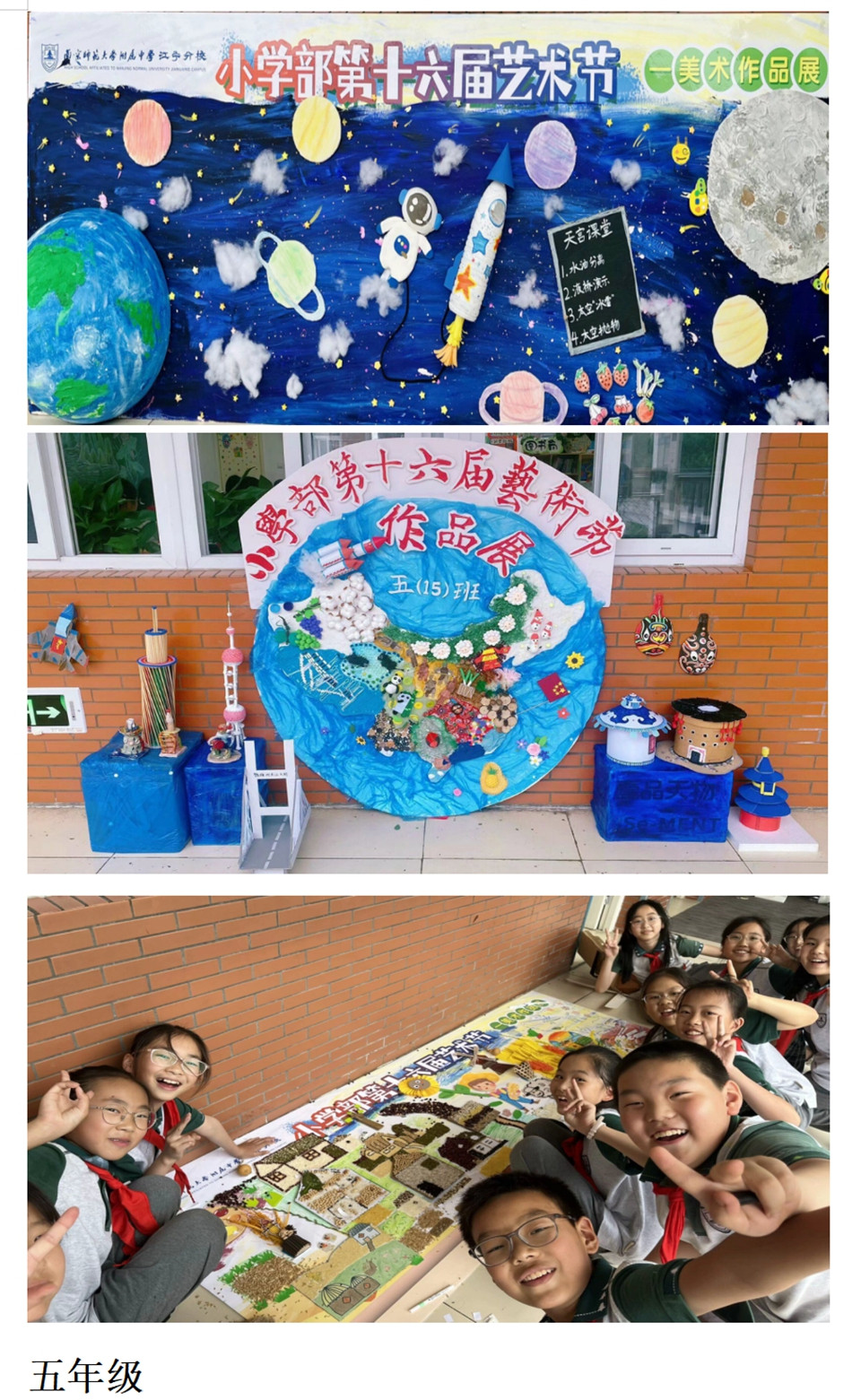 第三大项,美术作品展,这是送给孩子们的特别的六一礼物。老师们将学生的作品精心布置,美美的展示出来,让精品社团的同学们有了展示成果的平台,也让更多的同学欣赏美,感受美,激发创造美的动力。