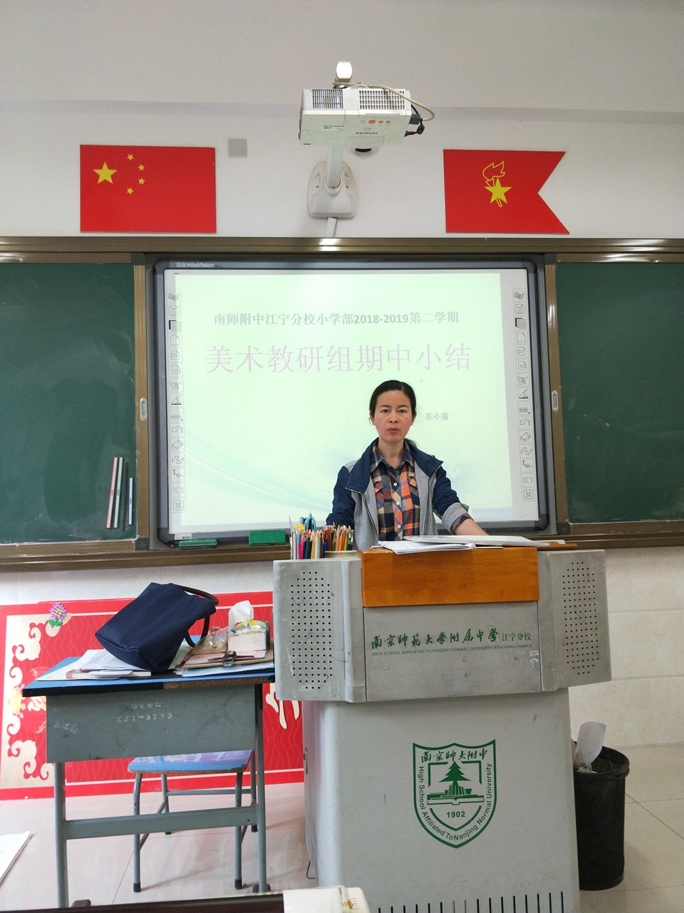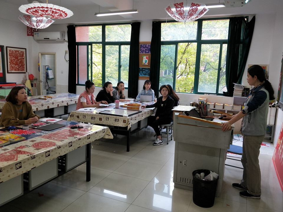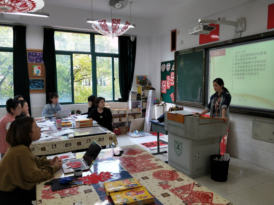 2019年5月10日星期五,小学美术组全体成员集中在一起,探讨半学期以来工作情况。教研组长苏小菊老师用PPT课件,详细的分析了美术组的工作中的亮点,图文并茂,让大家想起了工作中的点滴故事。全国剪纸活动的准备,教室的布置,树叶绘画,食堂文化环境美化等等,每一项工作都凝聚着大家的智慧。每位老师在工作中出色的表现被肯定,成绩被记录,大家心里都暖暖的,鼓足了干劲。苏老师对接下来美术组要做的工作进行了一一布置,要求大家团结一致,出色完成各项工作。老师们探讨细化自己的工作,争取工作出彩!