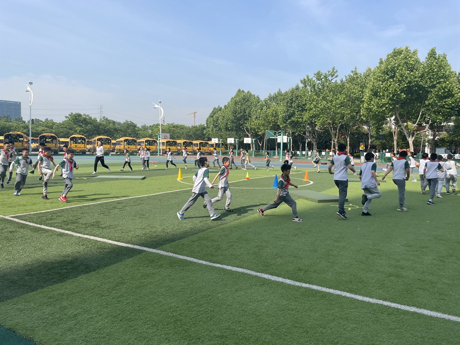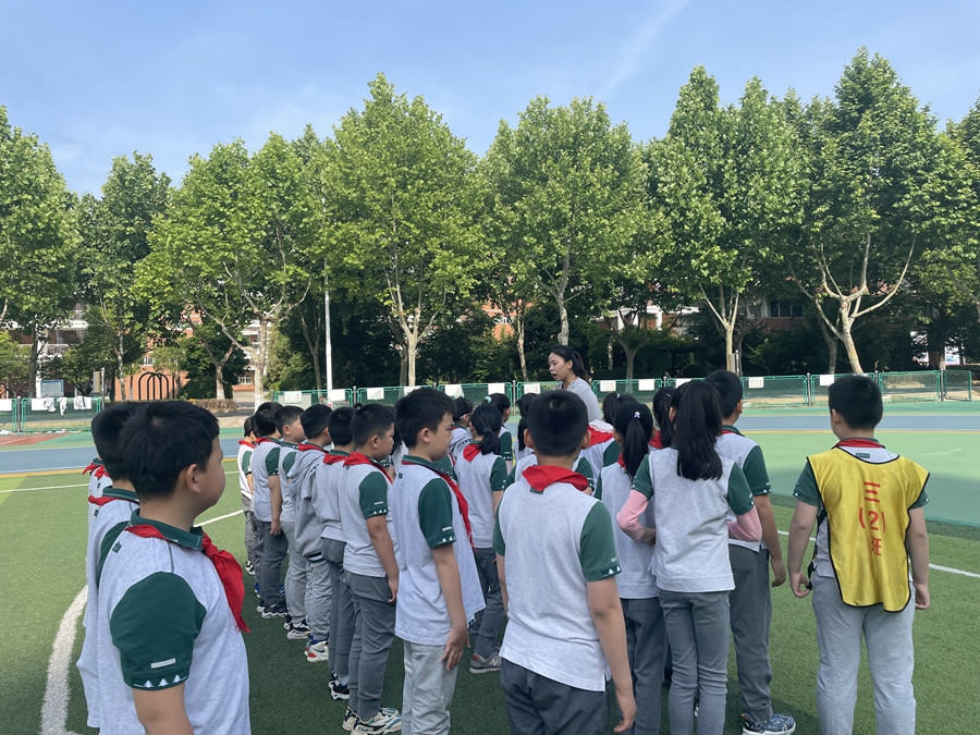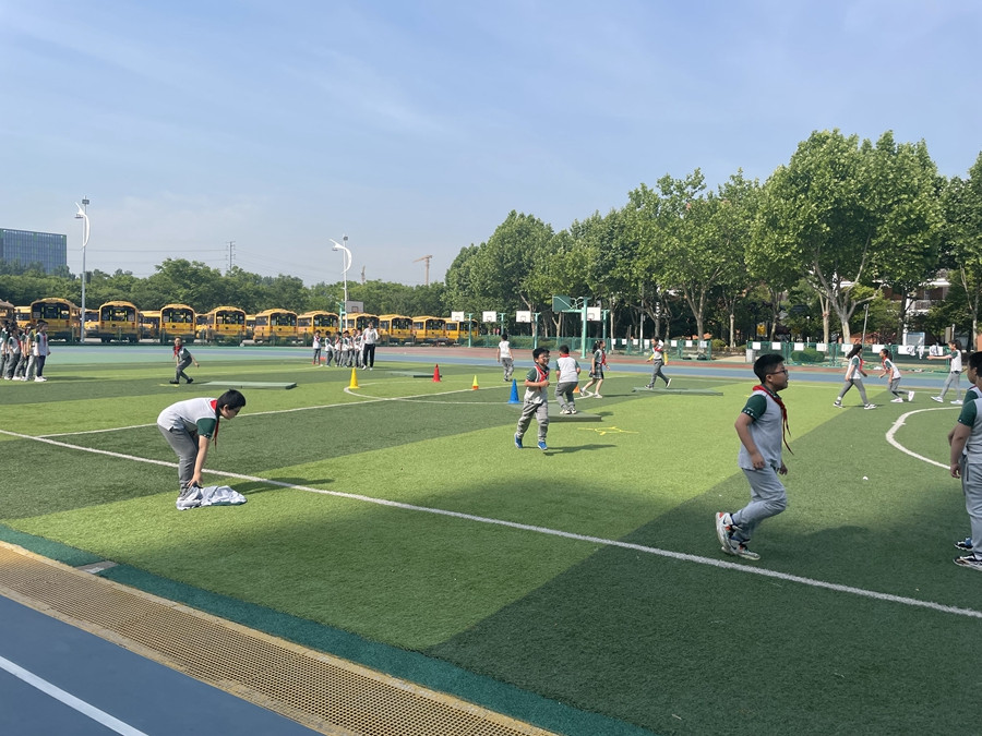 本周我校体育组举行了优秀教师示范课活动,全组同仁齐聚操场交流学习。2022年5月18日上午第一节课,优秀青年教师代表张颖老师在南操场给全组同仁上了一节《急行跳远》展示课。因为考虑到上课对象是三年级的学生,张老师从课的最开始设计中就一直想打破一下传统体育课的技能教学模式。技能教学的课堂容易枯燥每个动作的记忆重复会让学生参与性变低,所以张老师想通过情境创造的模式来上这节课,通过情境来贯穿教学主体,通过游戏来激发学生兴趣。在器材设计方面考虑到课堂内容的需要,张老师精心设计学生参与积极,学生一直在玩中学,学中玩。