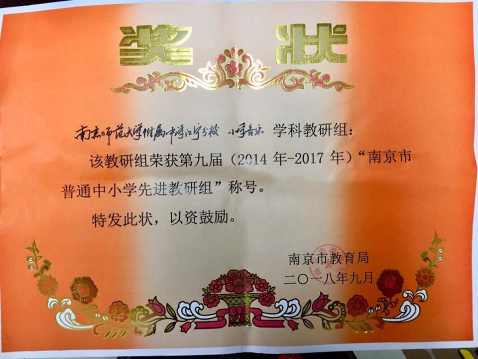 2018年9月,经南京市评审小组审核,音乐教研组荣获南京市第九届先进教研组