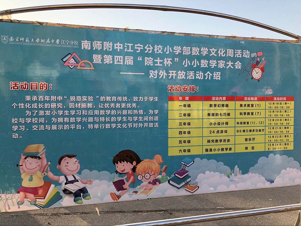 数学文化周以活动的方式集中展示数学学习成果,学校每年举办“院士杯小小数学家大会”,特邀知名数学家作讲座,举行数学探秘和数学游艺城堡等系列活动,吸引校内外数千名数学爱好者。学生参加华杯赛、时代杯数学竞赛等,获奖人数和层次居南京市前列。