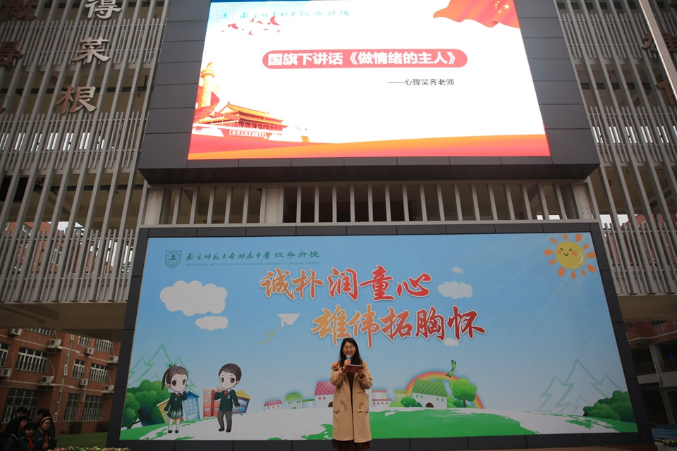 本次活动由六11中队承办升国旗、唱国歌、少先队员敬标准队礼,在嘹亮的国歌声中,五星红旗冉冉升起。专职心理吴齐老师进行精彩的国旗下讲话《情绪的主人》。吴老师先从大家熟知的emo这个话题谈起,有趣的情境描述感同身受同学们的真实生活,一下拉近了和大家的距离。吴老师同学们介绍了打败坏情绪的秘诀——把自己的身体想象成一栋房子,把困难情绪想象成到你家来拜访的客人,试着和你的坏情绪做朋友。任何情绪都是被允许的,你需要做的是接受和解读它。台下爆发阵阵会意的笑声。