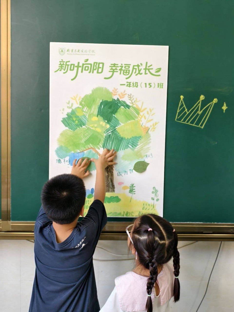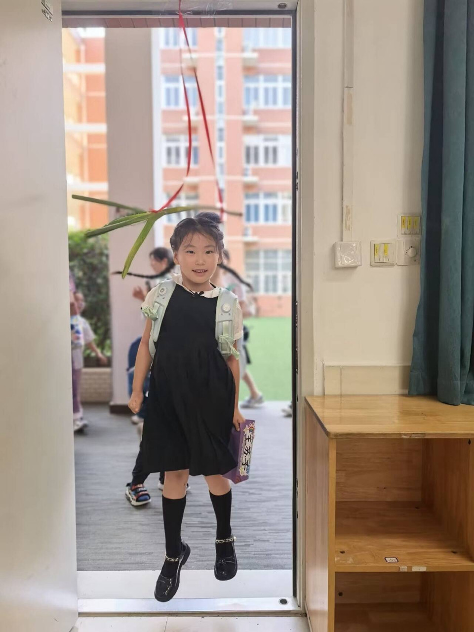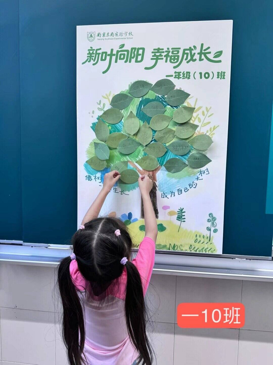 清晨,大队委学长学姐整齐列队,热情迎接新同学。各班教室门口别具一格的“顶葱门”吸引众多目光——孩子们跃起脚尖、轻触青葱,在“聪明伶俐、茁壮成长”的美好寓意中感受传统文化的魅力。随后,每位孩子在绿叶形卡片上认真写下姓名,亲手贴至班级“成长树”,瞬间“新叶”满枝,班集体初见雏形。这棵“树”将陪伴孩子六年成长,见证点滴进步。