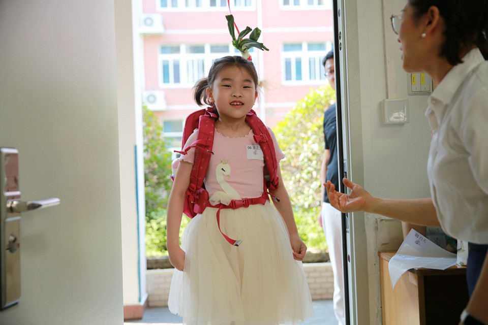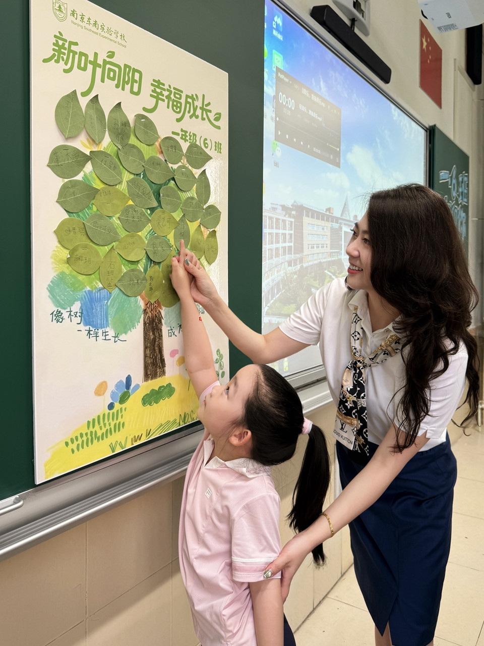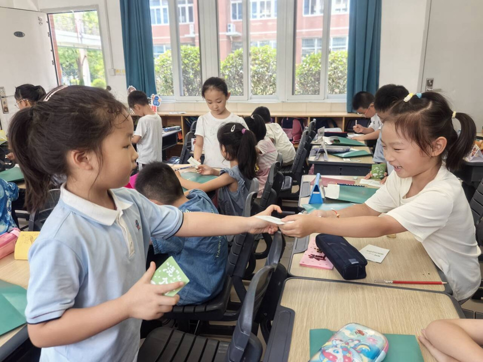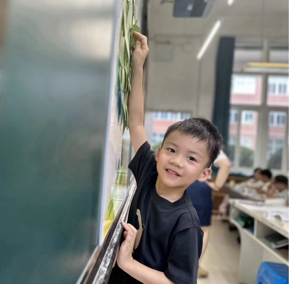清晨,大队委学长学姐整齐列队,热情迎接新同学。各班教室门口别具一格的“顶葱门”吸引众多目光——孩子们跃起脚尖、轻触青葱,在“聪明伶俐、茁壮成长”的美好寓意中感受传统文化的魅力。随后,每位孩子在绿叶形卡片上认真写下姓名,亲手贴至班级“成长树”,瞬间“新叶”满枝,班集体初见雏形。这棵“树”将陪伴孩子六年成长,见证点滴进步。