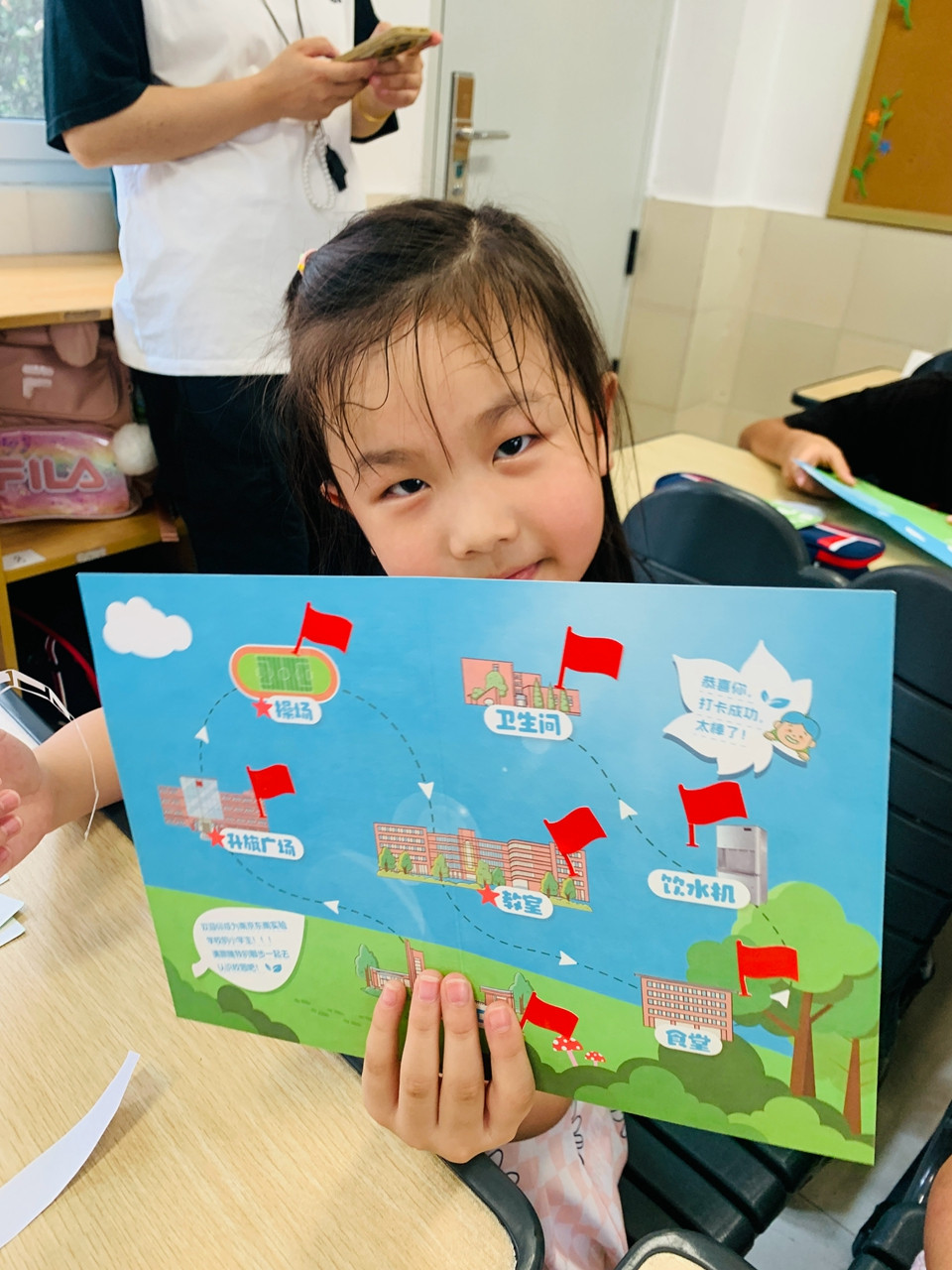 在老师引导下,孩子们化身“探险家”,通过趣味寻宝任务熟悉校园环境:认识国旗广场、运动场、餐厅和饮水设备,初步了解日常动线。这一环节不仅锻炼了观察与适应能力,也在协作中增进了同伴间的交流。