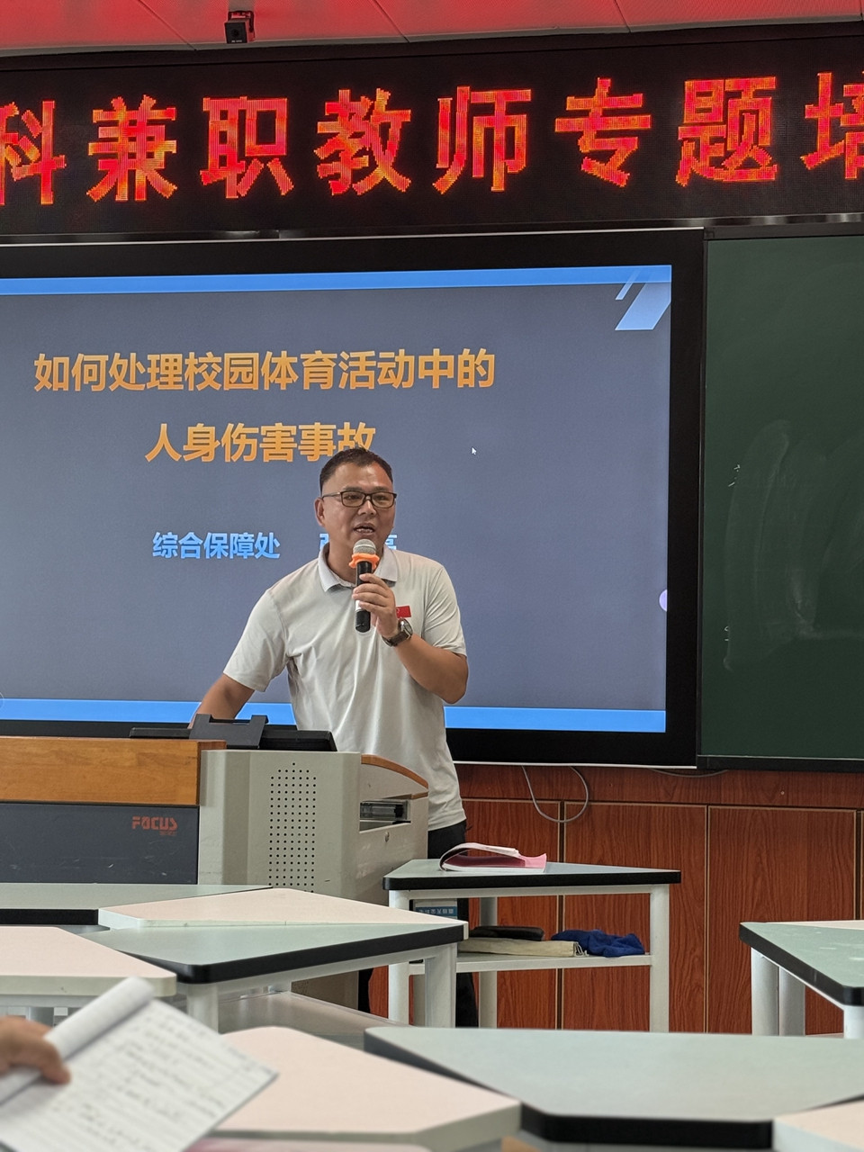 本次培训紧扣“实用、精准”原则,内容丰富、形式多样,涵盖了体育教学理论与实践操作多个方面。在理论培训环节,体育教研组组长吴晔老师围绕《义务教育体育与健康课程标准》,结合“每天一节体育课”的课时特点,详解如何设计分层教学方案——针对低年级学生,传授趣味游戏化教学方法,如将跳绳转化为“小绳变变变”闯关游戏。针对高年级学生,指导如何融入体能训练与团队项目,确保每节课“有乐趣、有强度、有收获”。综合保障处副主任张建亮老师还结合具体的案例,详细分析了体育课堂中的安全管理与风险防控,让教师们深刻认识到保障学生运动安全的重要性。
