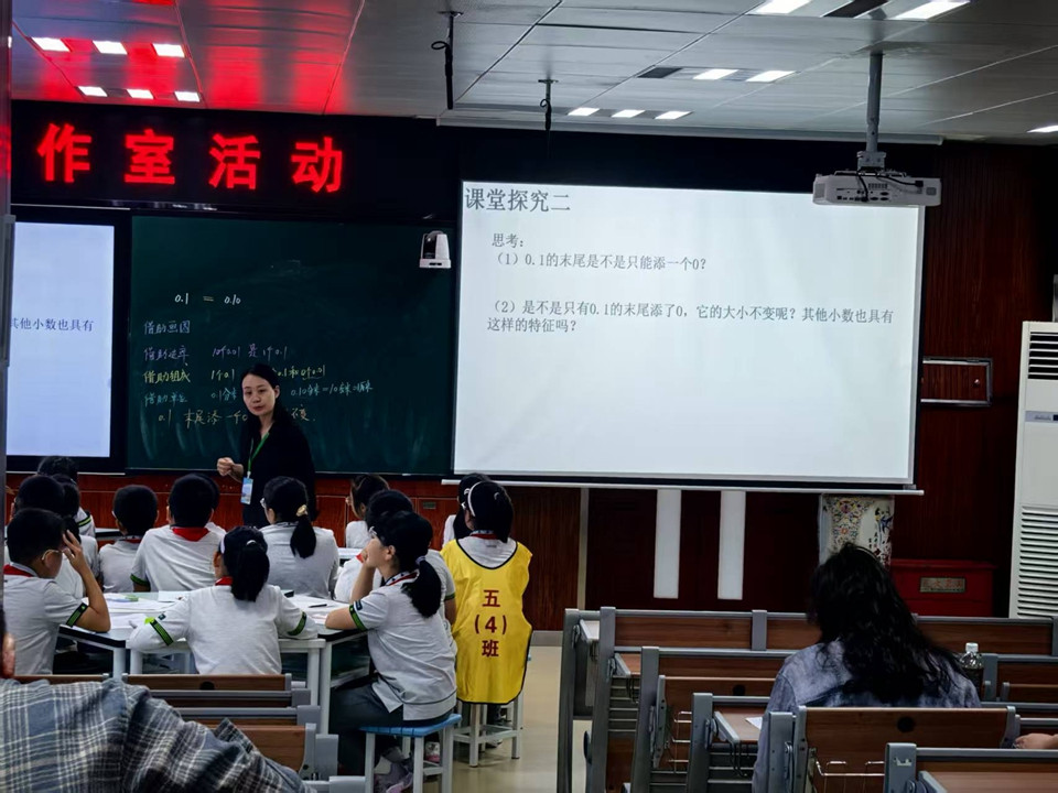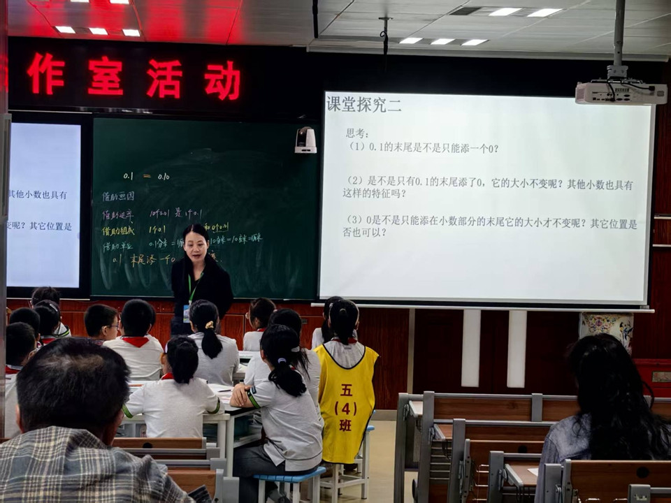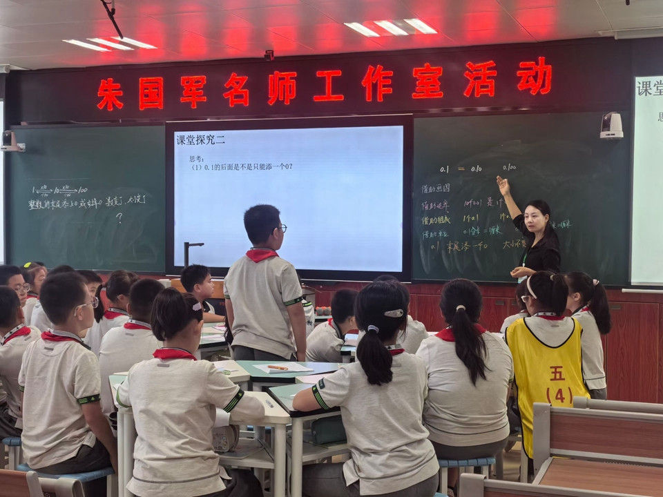 为深化“思维化课堂”实践,提升小学数学高段教学质量,近日,东南实验学校小学部朱国军名师工作室在高数组开展课例研讨活动。郁美华老师以《小数的性质》为题开设公开课,通过层层递进的教学设计,让学生在主动探究中实现思维进阶,为在场教师呈现了一堂兼具深度与温度的数学课堂。