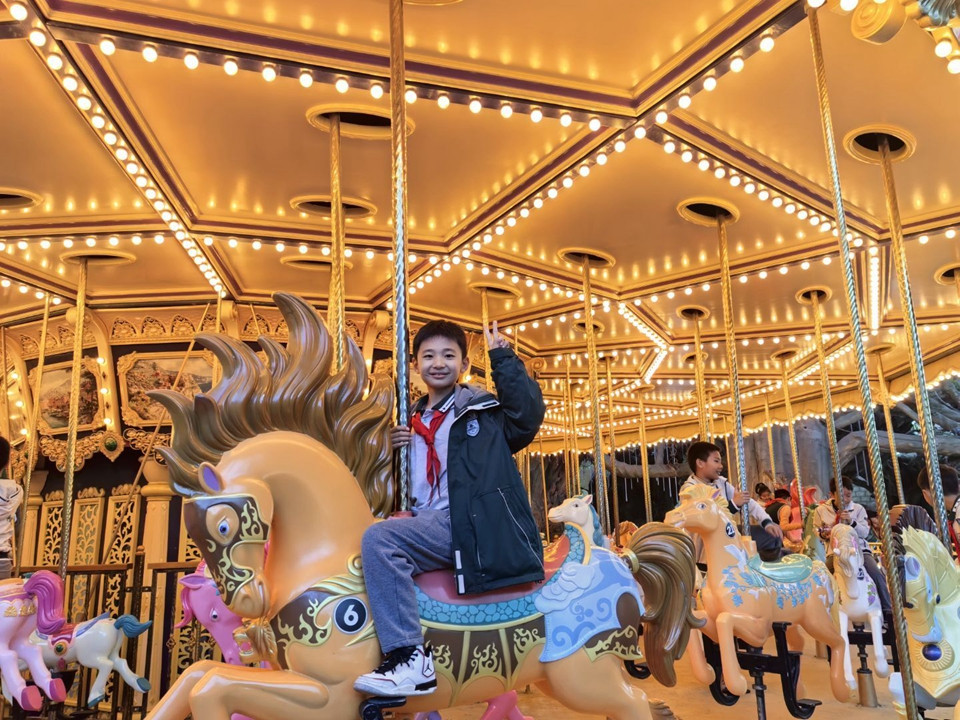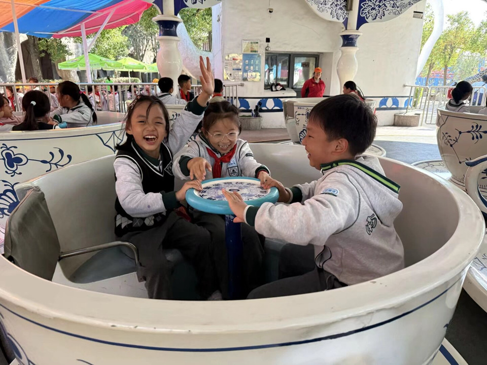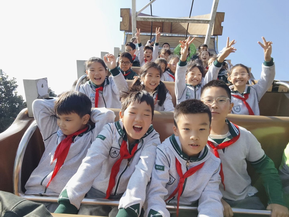 银杏湖乐园里,三年级学生开启了一场梦幻之旅。安徒生童话剧场里,经典角色跃然舞台;旋转木马上,纯真笑脸随音乐绽放;恐龙化石馆内,史前奥秘在专业讲解中层层揭开。午后,孩子们化身“自然艺术家”,采集落叶创作“秋日画册”,将想象力与创造力融入每一幅作品。这场融合童话、历史与艺术的多元体验,让学生在娱乐中学习,在创作中成长,真正实现了"寓教于乐"的教育理念。