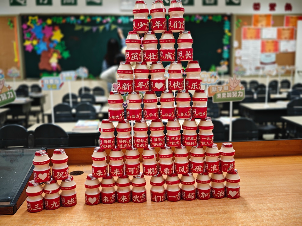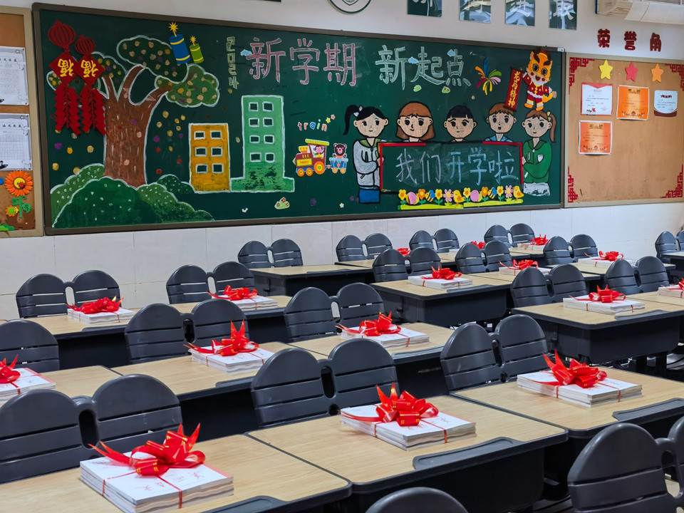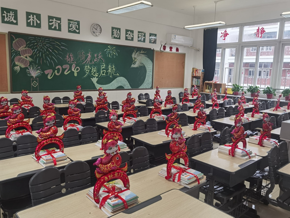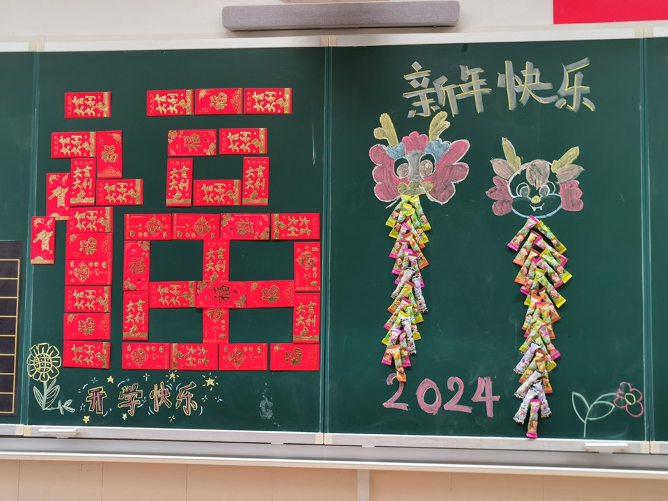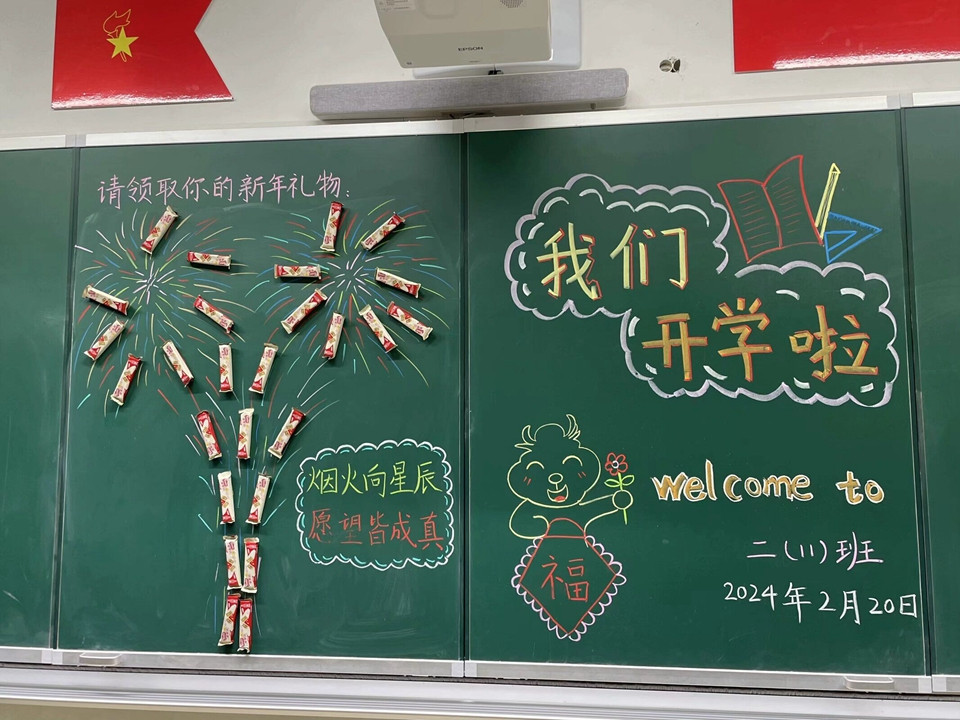 开学前两天,老师们就早早来到学校,领取教材、打扫卫生、布置教室,只为同学们回到熟悉的校园,依然能感受到家的温暖。大红的福字、叠高的饮料、甜蜜的棒棒糖、喜庆的烟花……都凝聚了老师对我们的爱。
