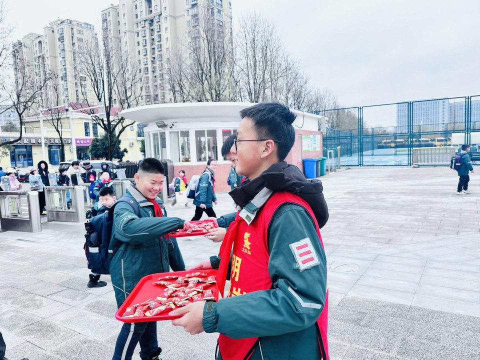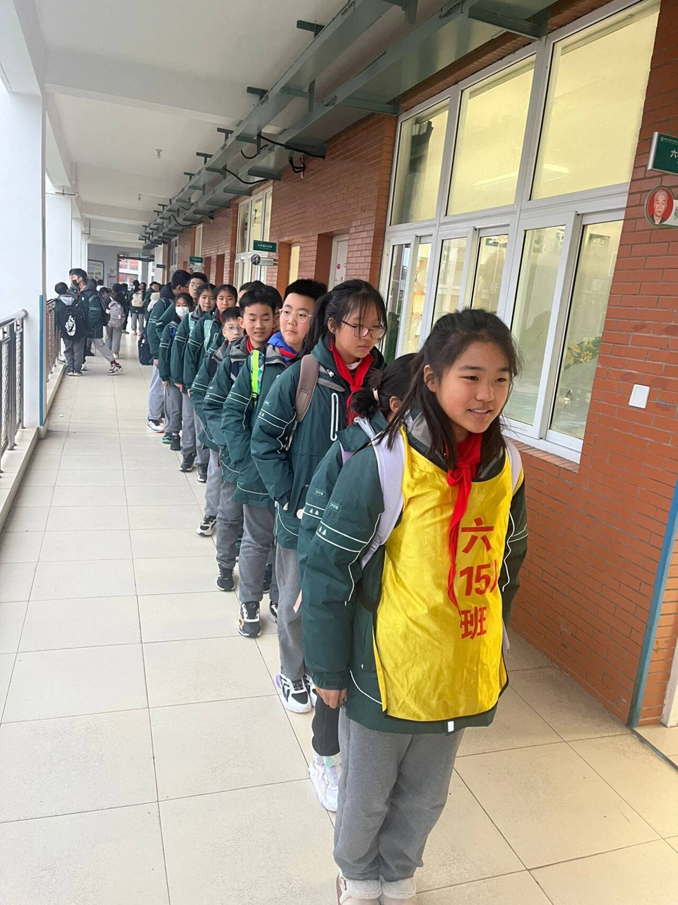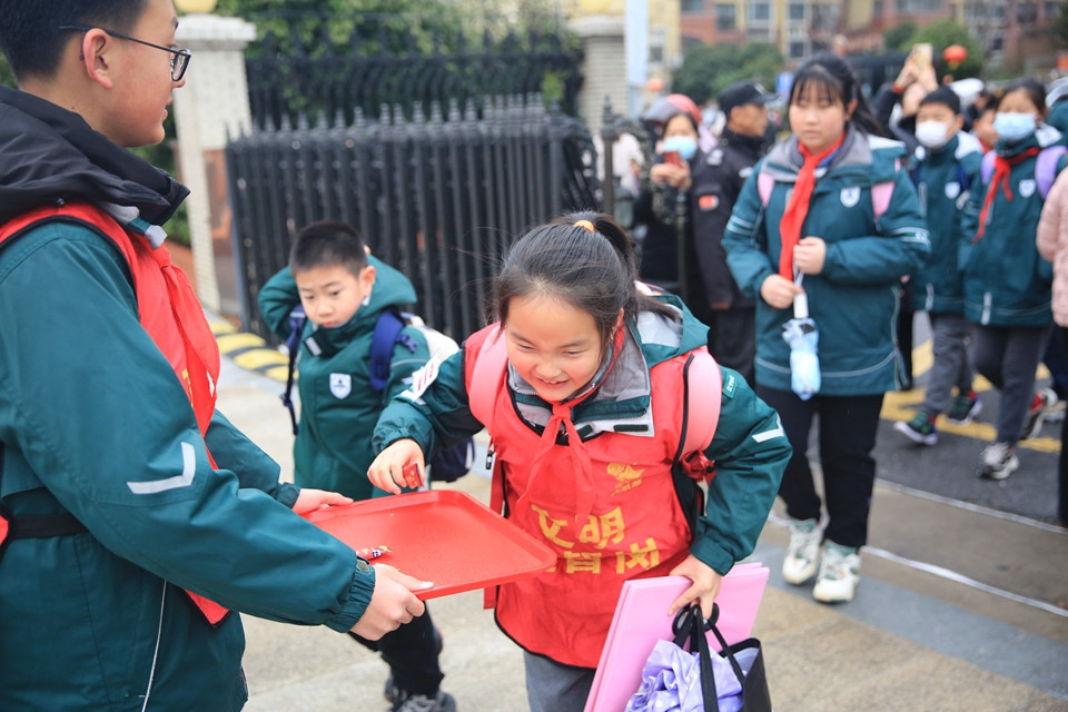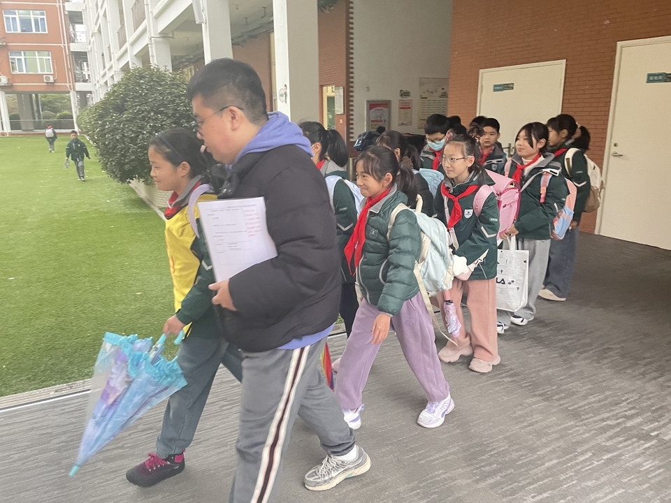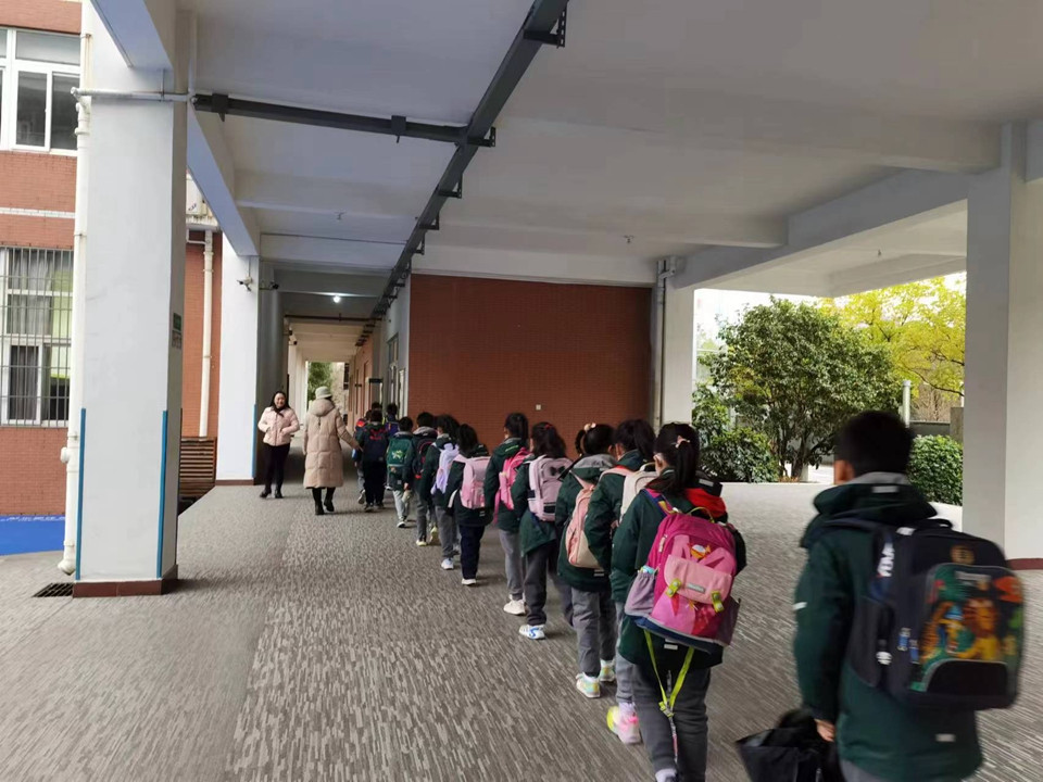 下午一点,同学们在父母的目送下,开心地“回家”啦!六年级的大队委同学早已站在门口迎接学弟学妹。
