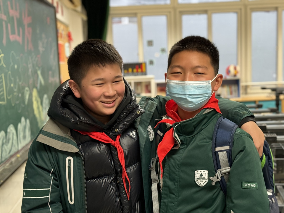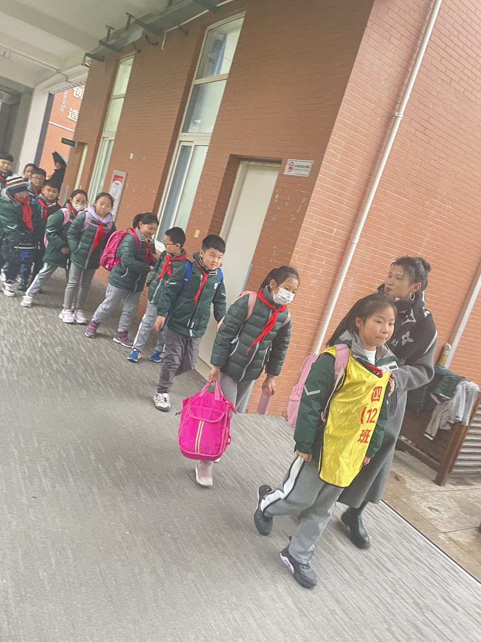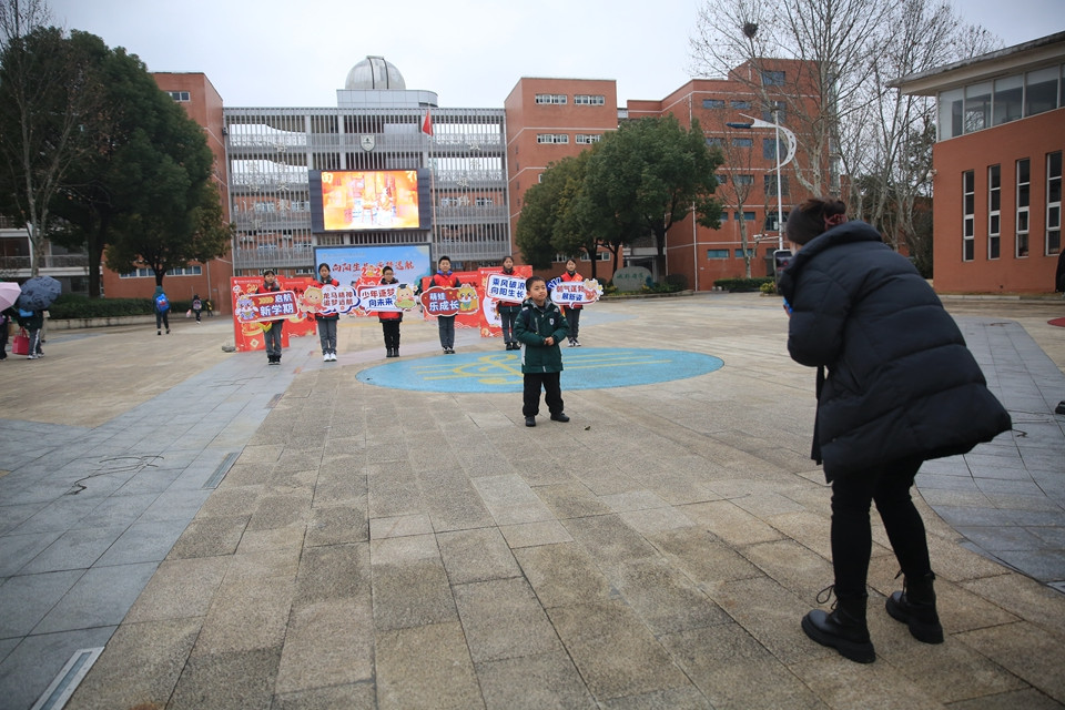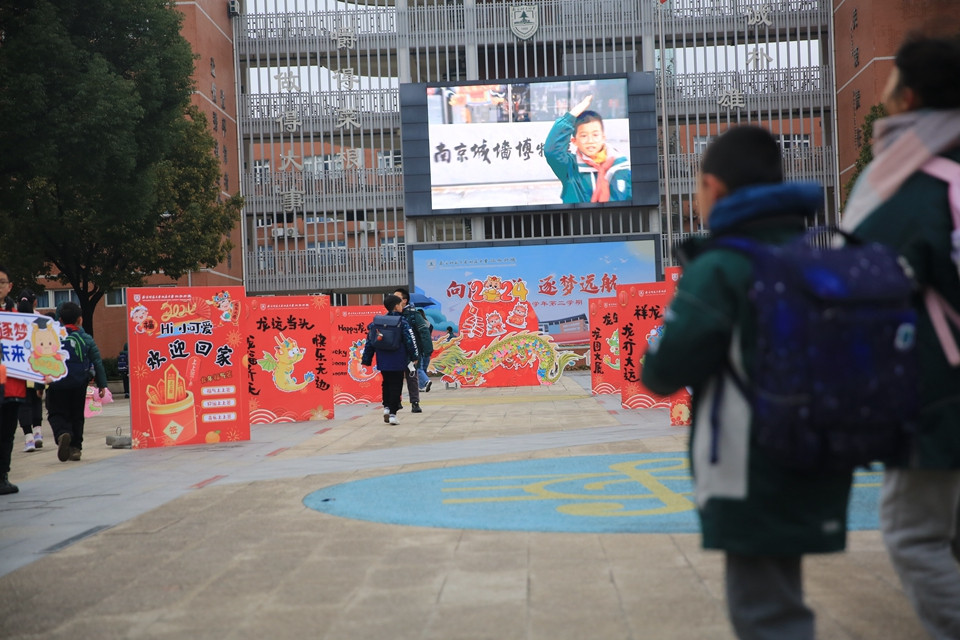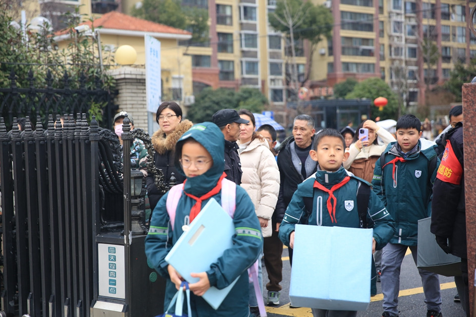 下午一点,同学们在父母的目送下,开心地“回家”啦!六年级的大队委同学早已站在门口迎接学弟学妹。