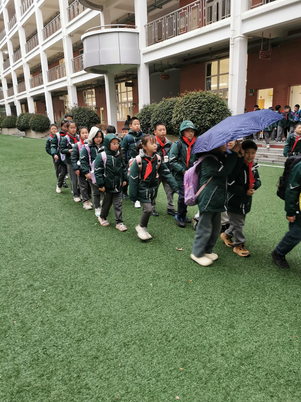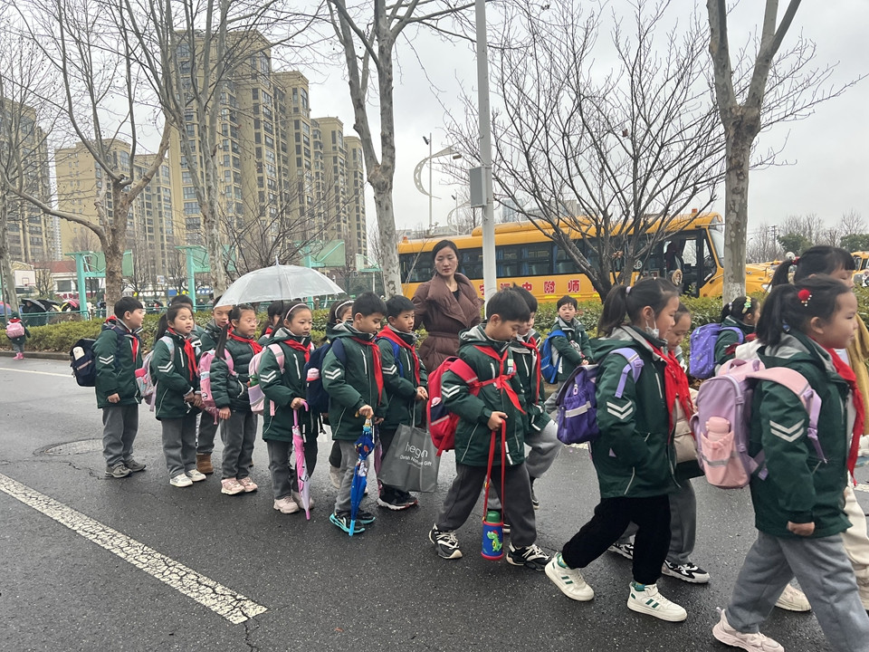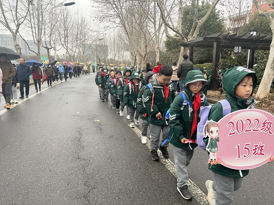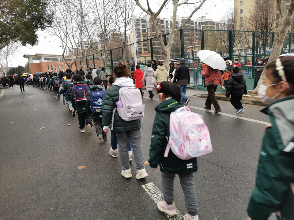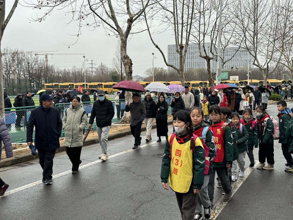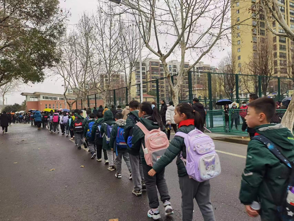虽然今天下雨,同学们在老师的护导下,排着整齐的队伍或乘坐校车,或要家长一起平安回家。