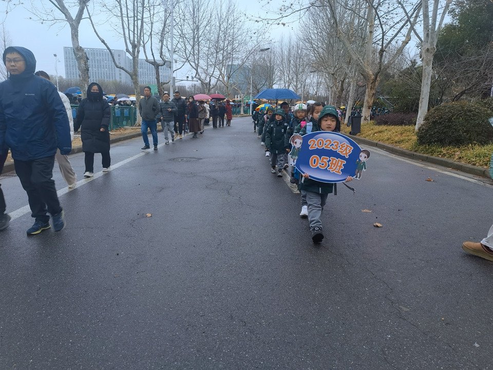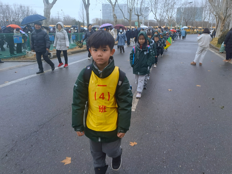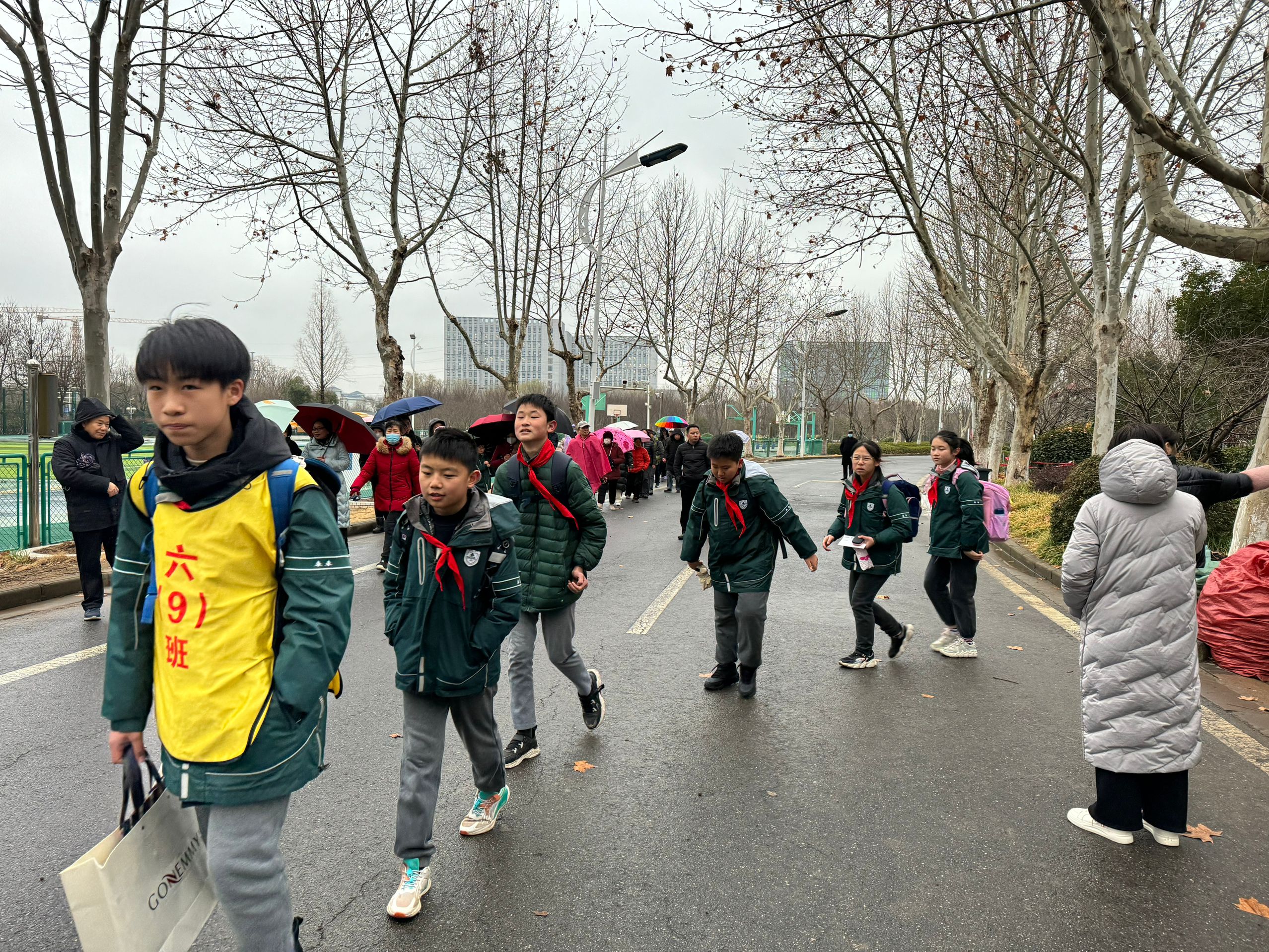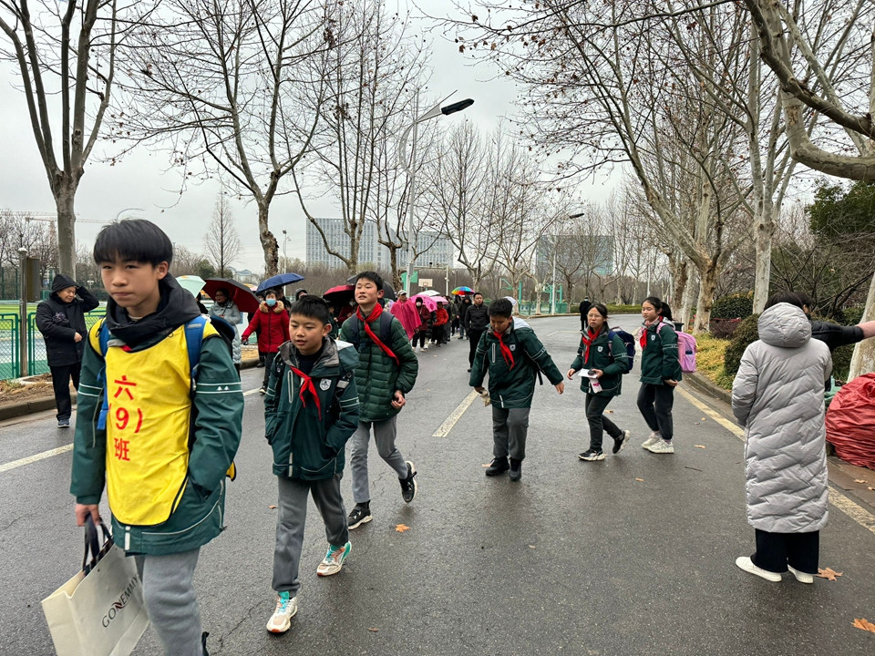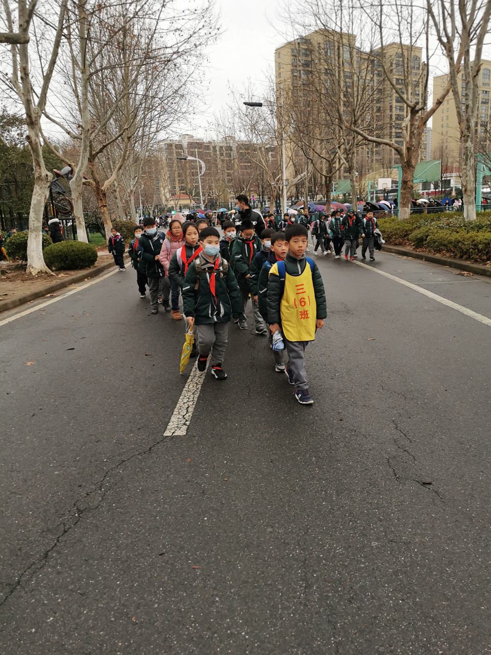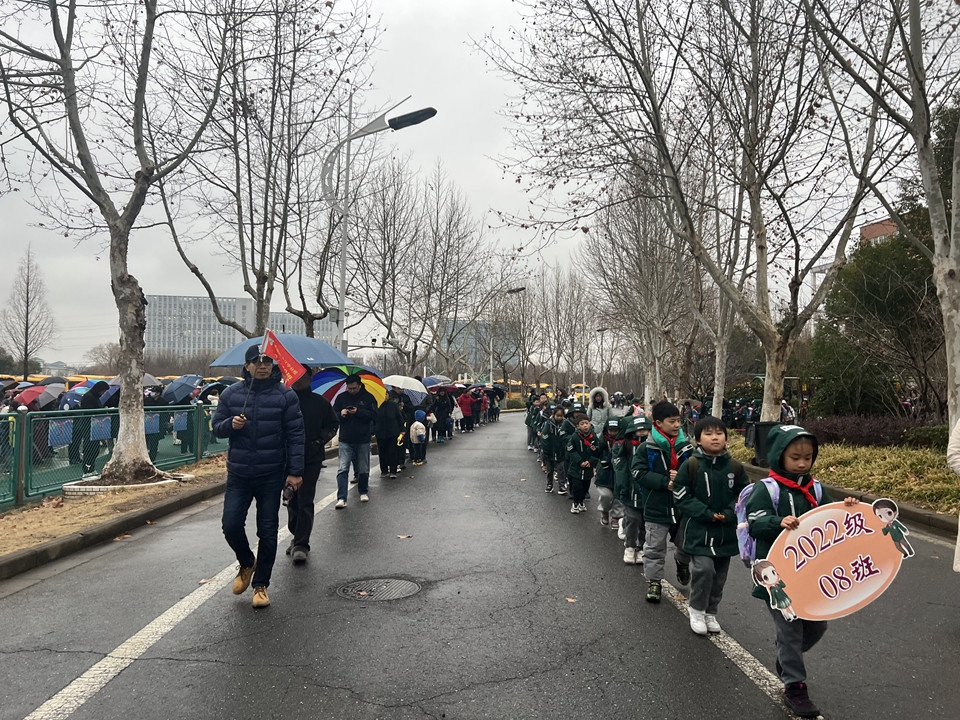 虽然今天下雨,同学们在老师的护导下,排着整齐的队伍或乘坐校车,或要家长一起平安回家。
