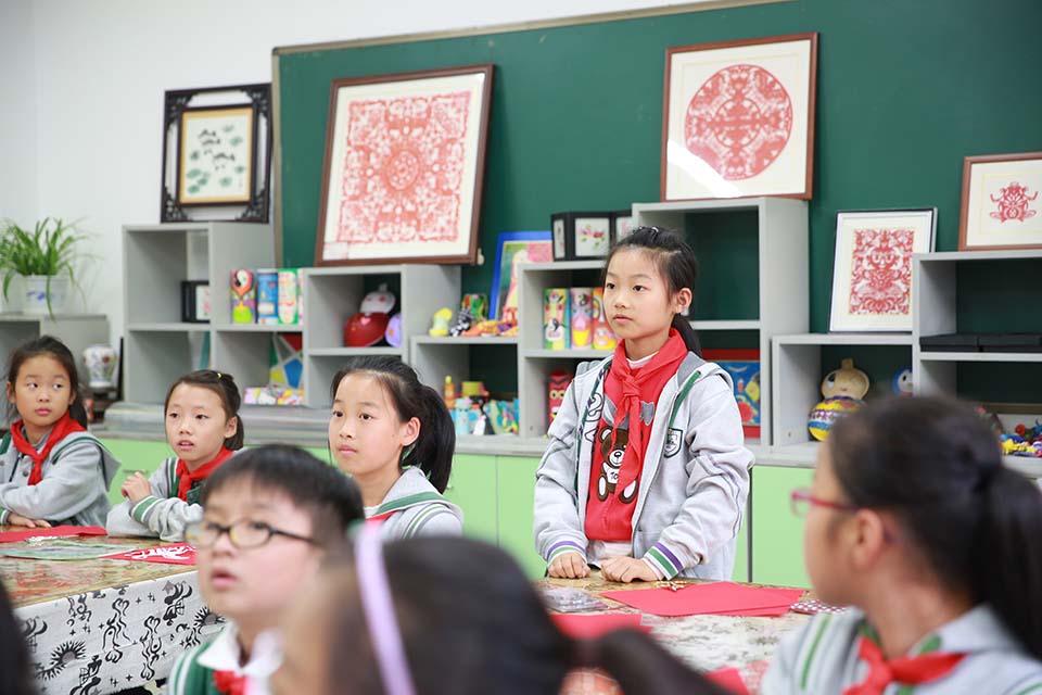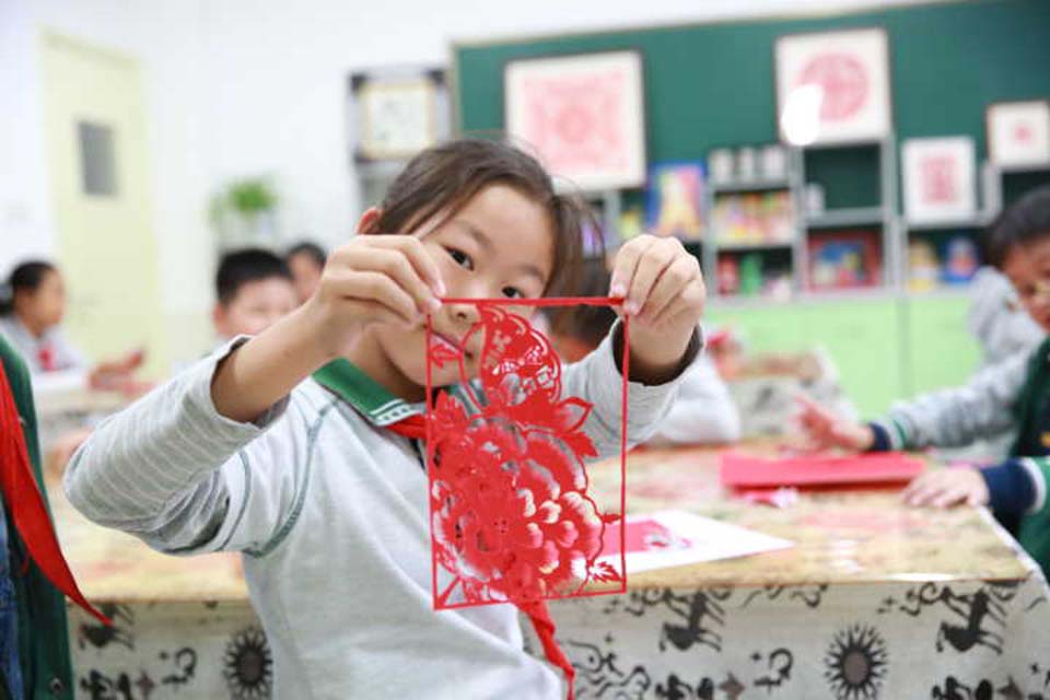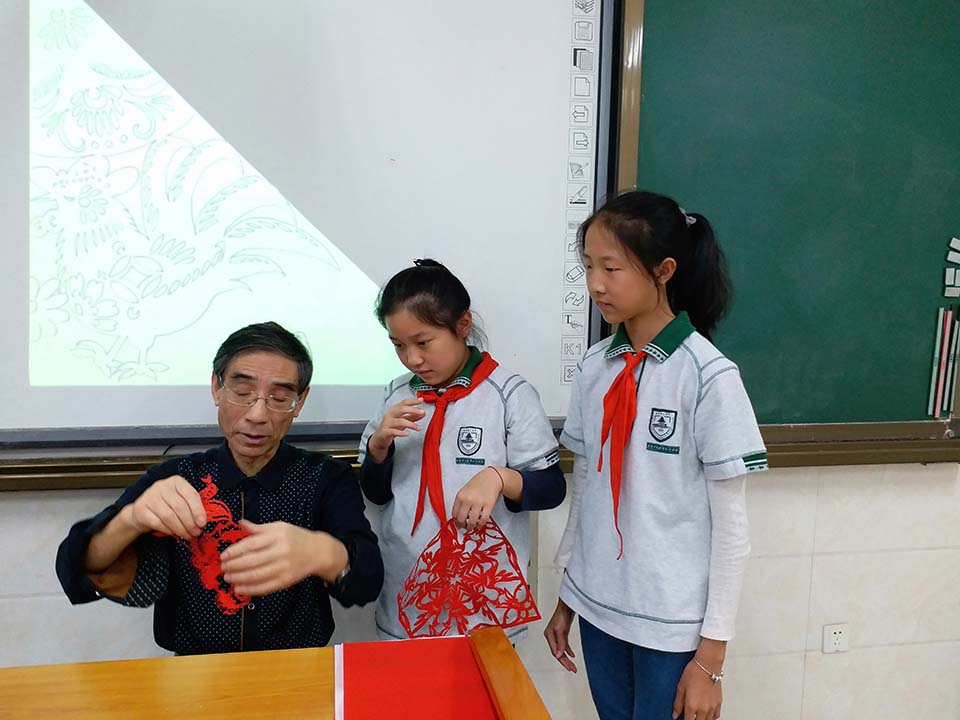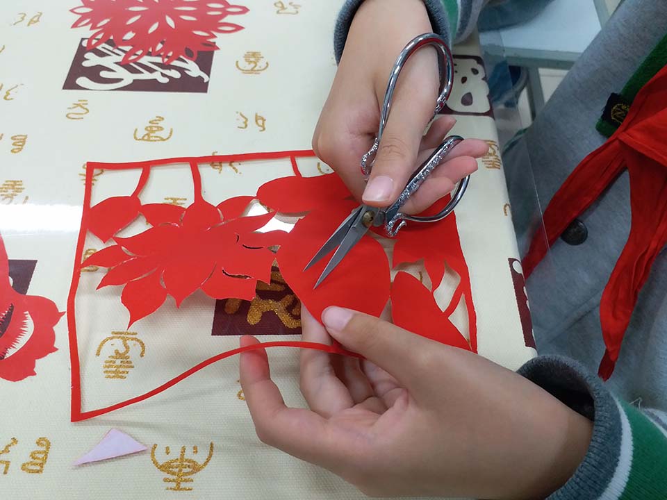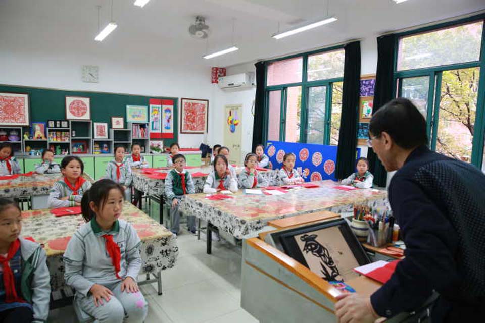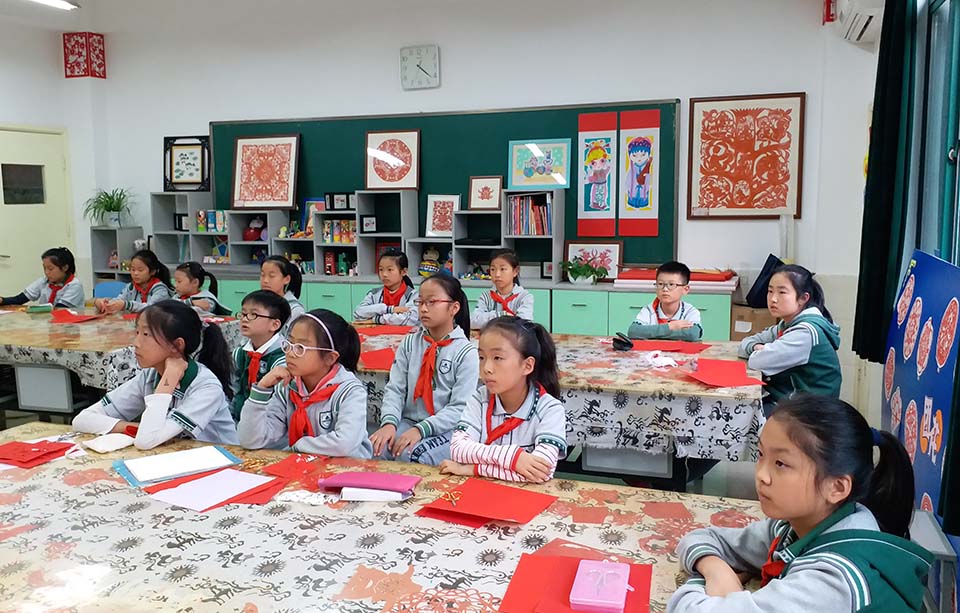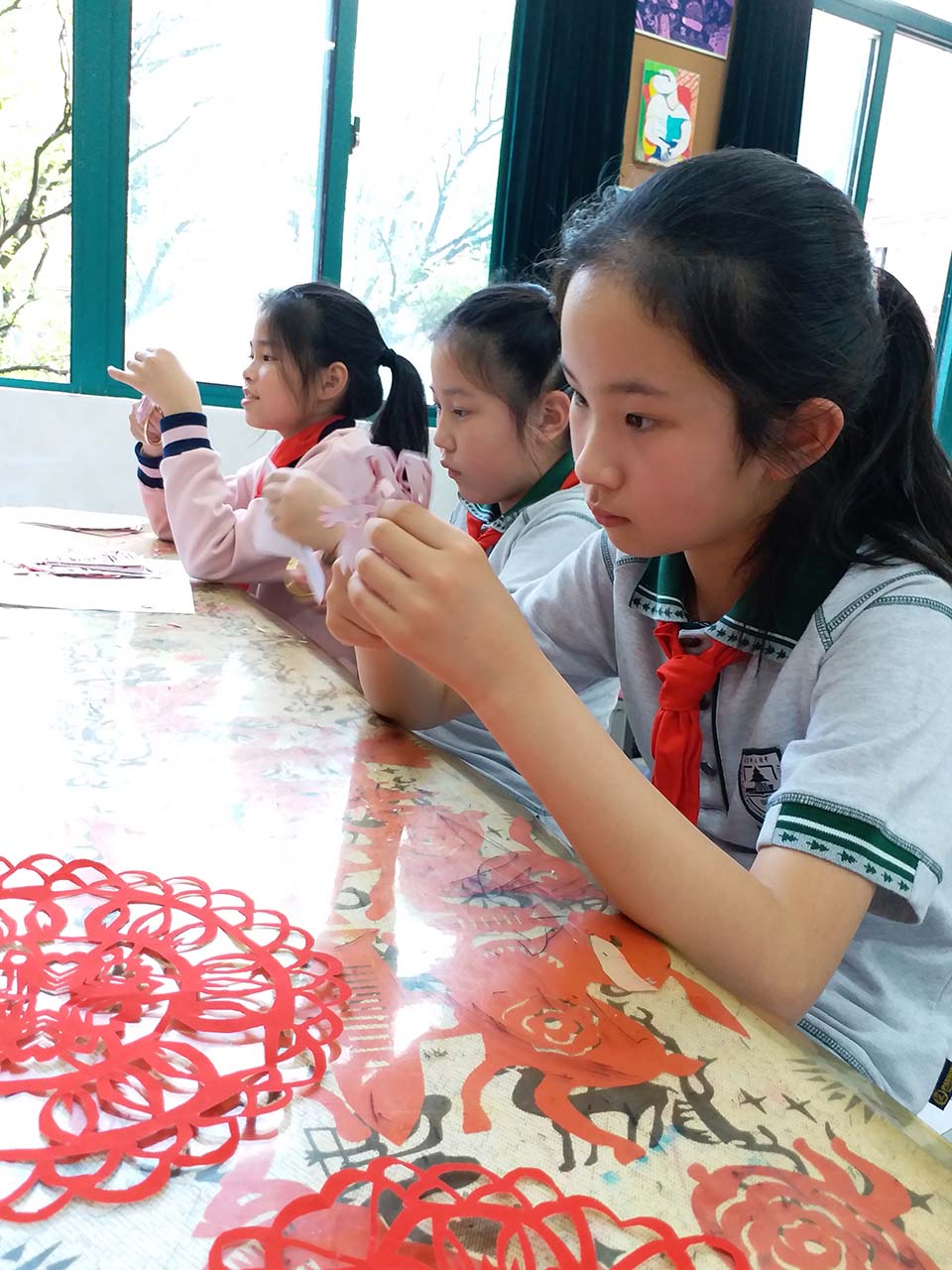 2016年南京大学文化与自然遗产研究所副所长陈竟教授将“非遗”剪纸课程引进我校,并先后请来多位非遗传承人来校进行剪纸教学和培训。现在我们不仅有非遗剪纸精品班,还在三年级每周开设一节剪纸课,由山西剪纸艺术家李爱萍老师进行授课,真正让“非遗”剪纸成为我们的校本课程。
