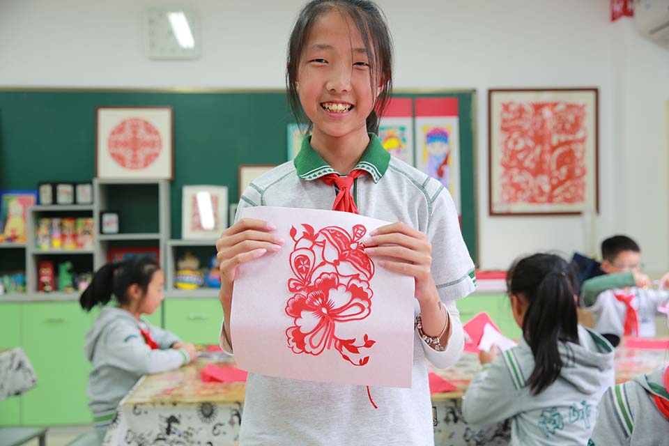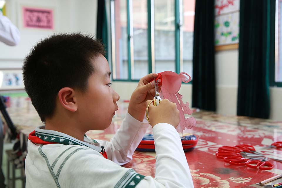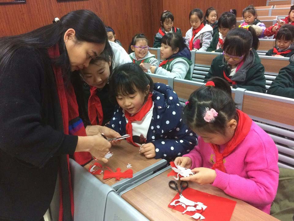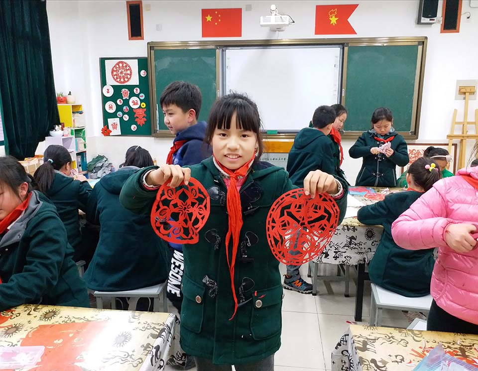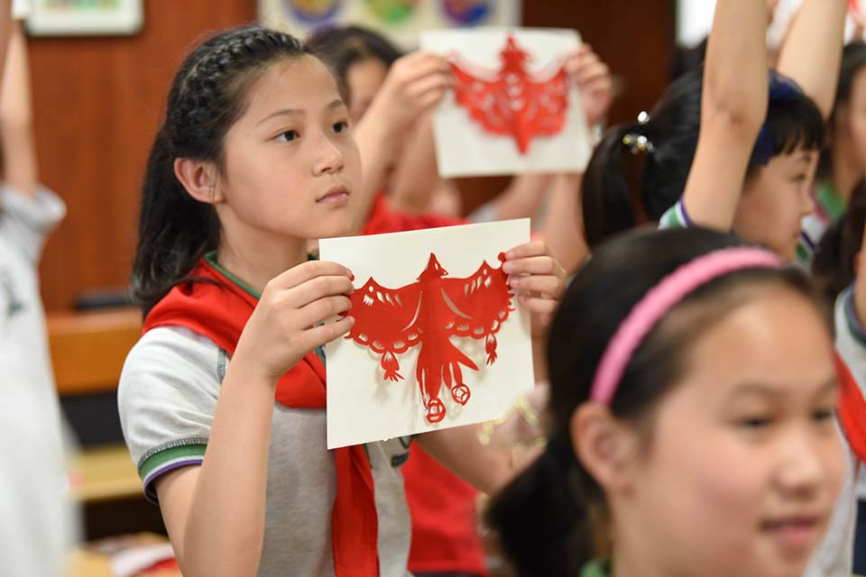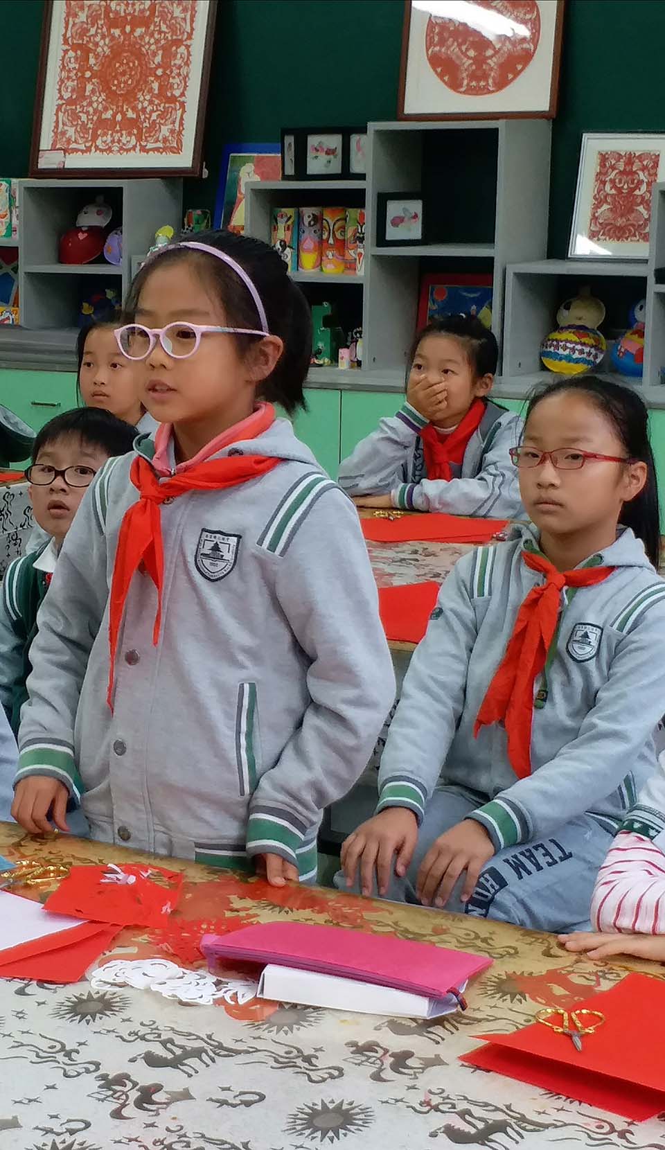 2016年南京大学文化与自然遗产研究所副所长陈竟教授将“非遗”剪纸课程引进我校,并先后请来多位非遗传承人来校进行剪纸教学和培训。现在我们不仅有非遗剪纸精品班,还在三年级每周开设一节剪纸课,由山西剪纸艺术家李爱萍老师进行授课,真正让“非遗”剪纸成为我们的校本课程。