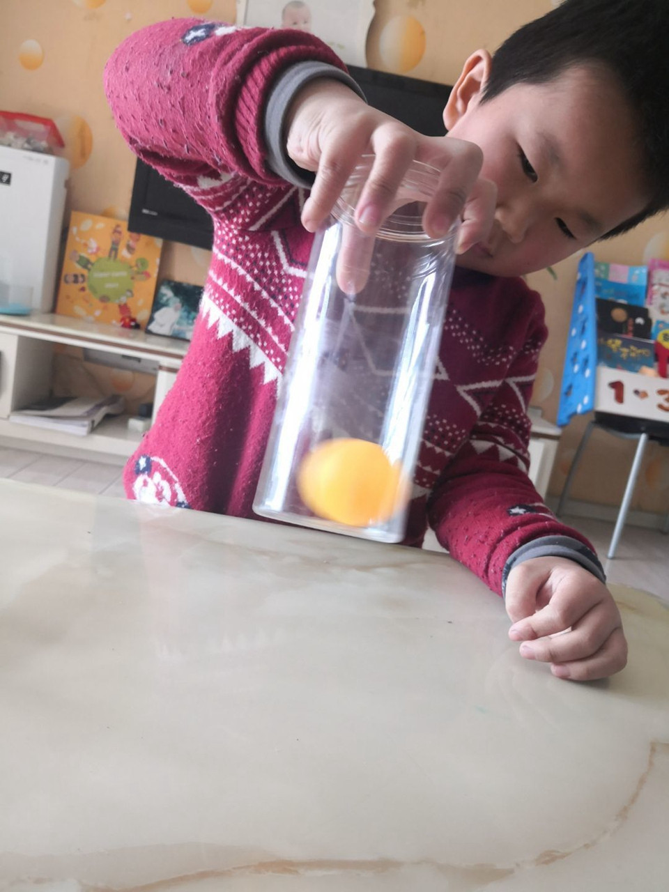 小朋友们除了能在桌上、地面上让乒乓转飞起来,还在水里和空气中分别做了乒乓球实验。