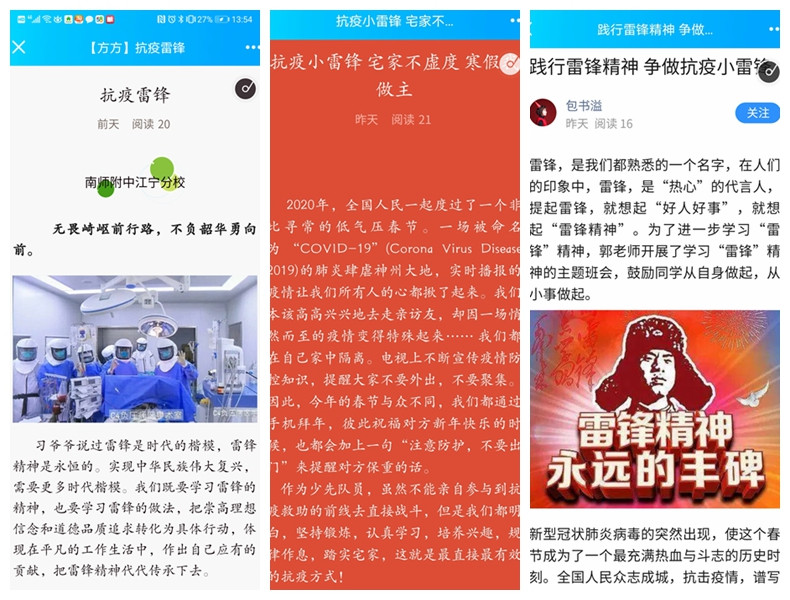 冠状病毒疫情限制了我们做志愿服务的脚步,却阻挡不了我们弘扬“雷锋精神”的热情。那些身着白大褂的“逆行者”,那些在战“疫”中默默奉献的人,都是值得我们为之洒泪、为之歌颂的英雄。我们感动于“雷锋”们的付出,更不忘弘扬他们的大义。疫情下我们该如何学习雷锋呢?南师附中江宁分校小学部这样做: