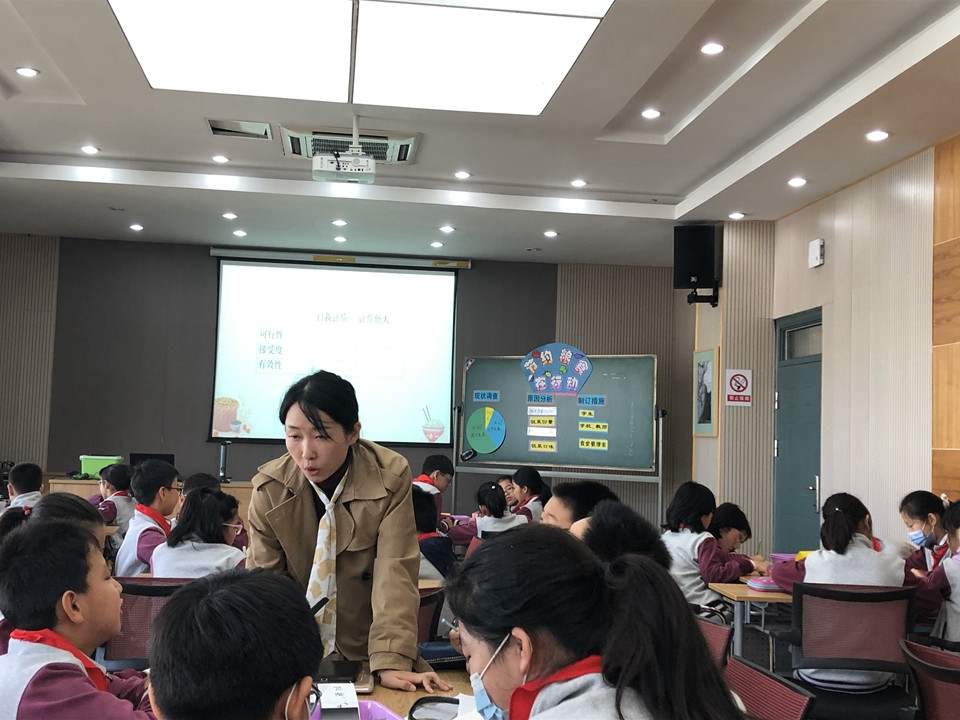 王圆圆老师经过精心准备,反复磨课,向评委们呈现了一堂设计巧妙、来源于学生生活的综合实践活动课《节约粮食在行动》(五年级)。在活动中,学生了解今年的诺贝尔和平奖,认识世界粮食现状,并且通过调查研究本班的光盘数据,发现问题、分析原因。教师引导学生对于具体问题进行讨论、分析,发挥学生的主动性,尝试制订措施。在整个过程中,学生学会了多元化地思考问题,学会了从一个具体的角度探讨问题解决的途径。这些都值得我们学习和思考,再次向王圆圆老师表示祝贺!