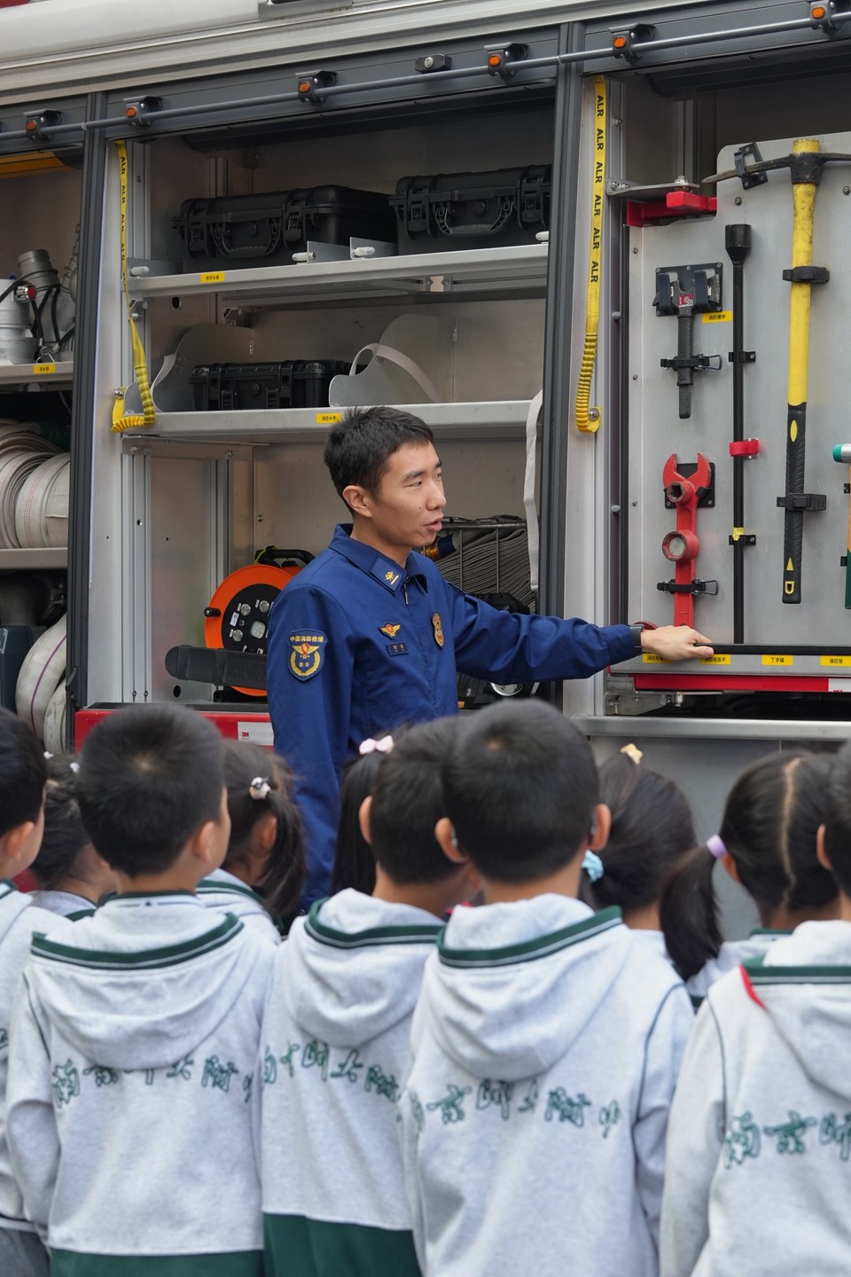 “哇!好高的消防车!”一进救援站大门,五辆通体鲜红的消防车便如“钢铁巨人”般矗立在广场上,瞬间抓住了所有孩子的目光,此起彼伏的惊叹声打破了营区的宁静。消防员叔叔们早已在车旁等候,脸上带着亲切的笑容,主动打开消防车的侧门与后盖——仿佛打开了装满“魔法装备”的百宝箱。“这是能剪断钢筋的液压扩张钳,像大力士的手臂;这是破拆斧,能在墙体上开出生命通道;这卷看起来普通的水带,压力足够时能喷射出30米远的水柱……”消防员叔叔一边手持器材演示,一边用孩子们能听懂的语言讲解用途,原本冰冷的器械在生动的介绍中变得鲜活起来。孩子们纷纷踮起脚尖,有的凑到器材旁仔细观察,有的举起小手追问“叔叔,这个工具能举多重呀?”“水带破了怎么办呀?”,消防员叔叔耐心细致地逐一解答,现场互动热烈又温馨。