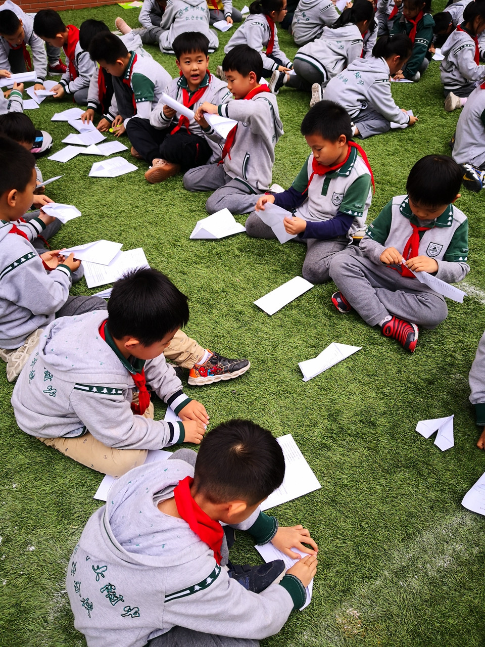 在这秋高气爽的11月,南师附中江宁分校以“节能、环保、健康”为主题的十二届科技节拉开帷幕。本周二下午,二年级组迎来了年级活动的重头戏——纸飞机竞技赛。第二节课后,二年级全体同学齐聚在B4楼前的草坪上。在陈丽君主管的开始哨声响起后,同学们紧锣密鼓地开始折叠纸飞机。每位同学限时15分钟,利用废旧纸张折叠出两架纸飞机。制作完成后,各班级分批次在赛道上进行飞行比赛。孩子们手持自己精心制作的2架纸飞机,在班主任老师的带领下有序地来到赛道前准备比赛。别看这一架架不起眼的纸飞机,它们可是孩子们智慧与巧手的结晶,是孩子们提前学习折叠纸飞机和研究纸飞机的成果。