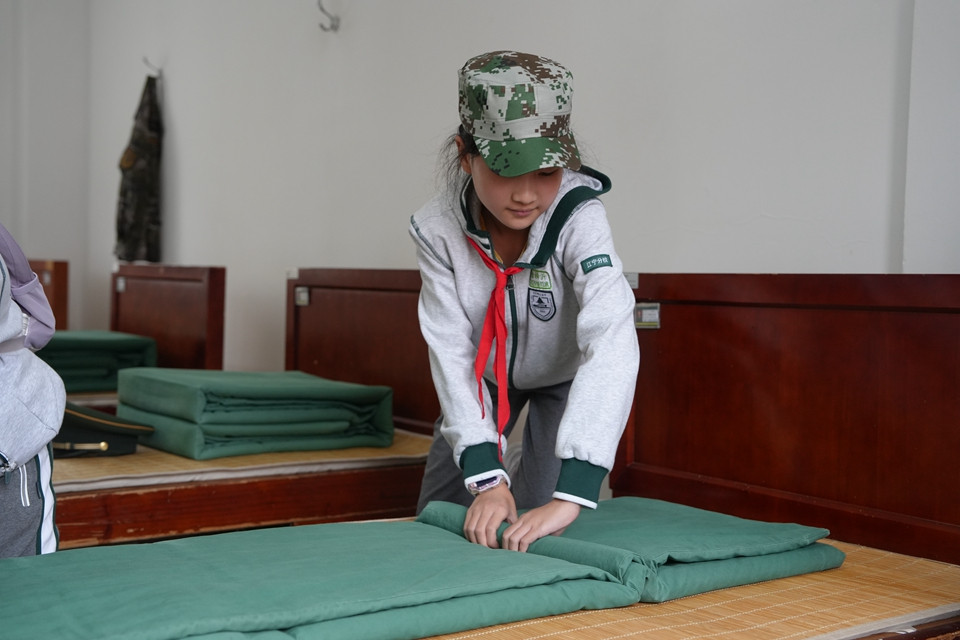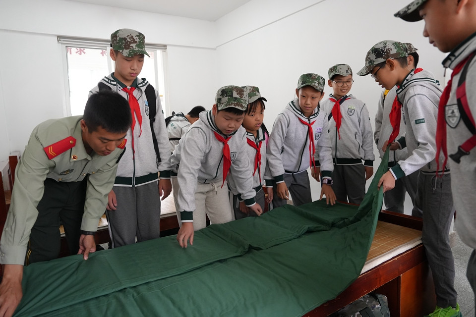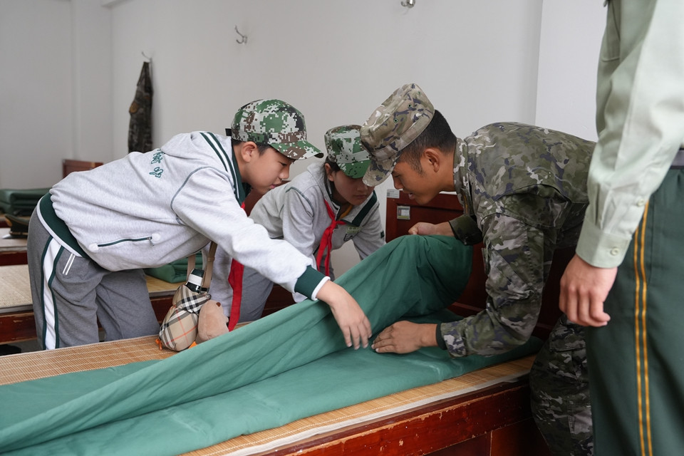 进入内务参观与体验环节,队员们每10人一组,整齐有序地走进班排宿舍。一尘不染的环境、整齐划一的物品摆放,尤其是那棱角分明、“豆腐块”般的被子,令同学们赞叹不已。4名班长耐心细致地为队员们讲解并示范了叠“豆腐块”被子的技巧与要领。在班长的鼓励下,队员们纷纷动手尝试。大家齐心协力,通过“三折叠”、折“毛毛虫”凹凸法、修直角等步骤,共同完成了“豆腐块”作品。尽管满头大汗,但团队协作带来的成就感让大家格外快乐,也亲身体验了军队严谨细致的作风。