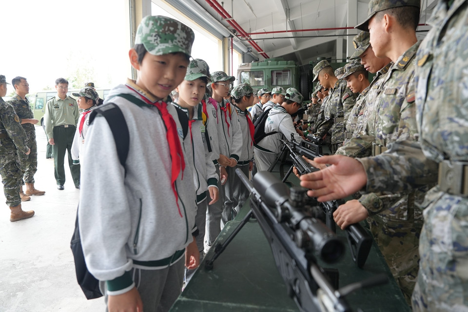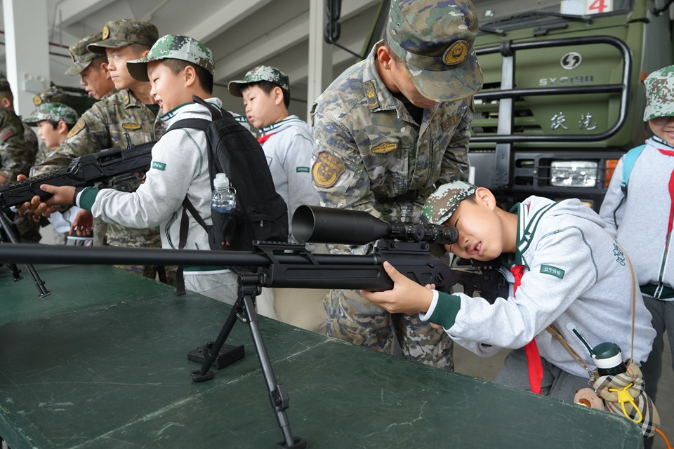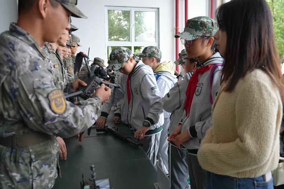 武的防暴装甲车、功能先进的防化洗消车、灵活轻巧的无人机,以及科技感十足的机器狗依次排列,指导员一一详细讲解这些装备的性能与用途。队员们还进行了枪械体验,近距离观察手枪、狙击枪等武器。了解到现代科技在军事领域的广泛应用,队员们热烈讨论,一边感受现代军事装备的魅力,一边在心中埋下了科技强国的种子。