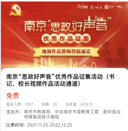 今年四月,由我校党委组织拍摄的题为“寻访英雄足迹,赓续红色基因”视频参加由南京市教育、南京市教育工委举办的南京“思政好声音”优秀视频作品征集,作品通过初审并正在“少年志”平台参加展演。