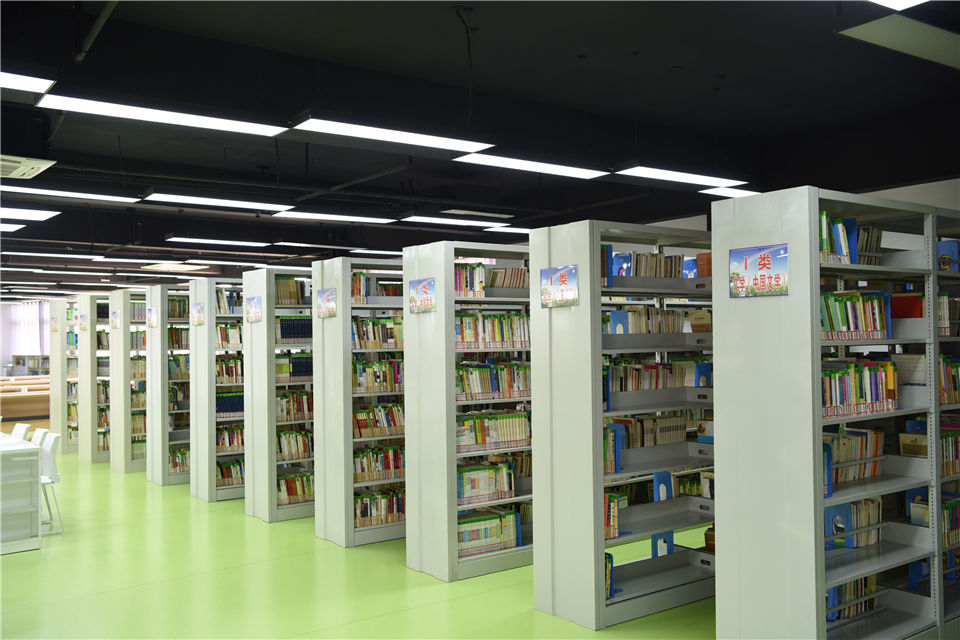 学校图书馆共三层,一层专题服务小学学生,二、三层专题服务中学学生及全体教师、职工,使用面积共三千余平方米。图书馆有九个阅览区域,其中一层阅览区二个,二层阅览区三个,三层阅览区四个,阅览座位八百二十七个。三个电子阅览室座位七十二个。