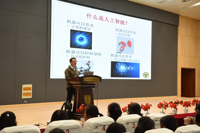 2019年11月8日晚上,学校报告厅不时传出掌声和笑声。东南大学教授、博士生导师、东南大学认知智能研究所所长、著名人工智能专家漆桂林老师为高一同学做了一场题为《人工智能进展》的精彩讲座。在讲座中,漆教授从和学生探讨什么是人工智能引入,介绍了人工智能在当下应用的典型案例,回顾了人工智能的发展史,让同学们了解了人工智能发展历程中的重要事件和重要人物。漆教授还向同学们介绍了机器学习、神经网络、自然语言理解、知识图谱的原理和实现的方法。讲座过程中,漆教授用大量丰富而前沿的案例和深入浅出的解说深深地吸引在场的每一位同学,帮同学能够更加理性地思考人工智能,并对人工智能产生了浓厚的兴趣。