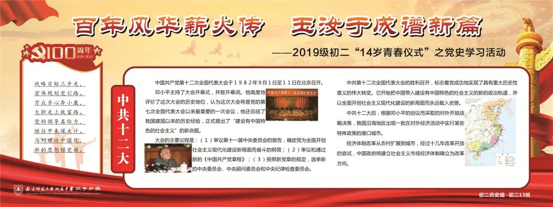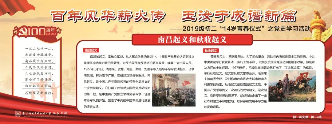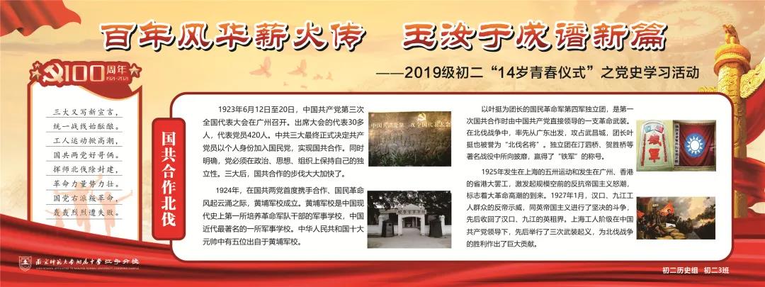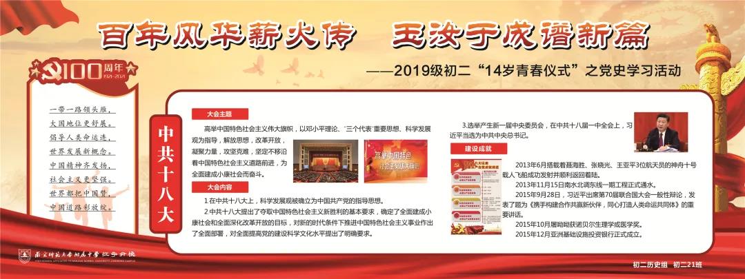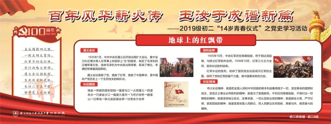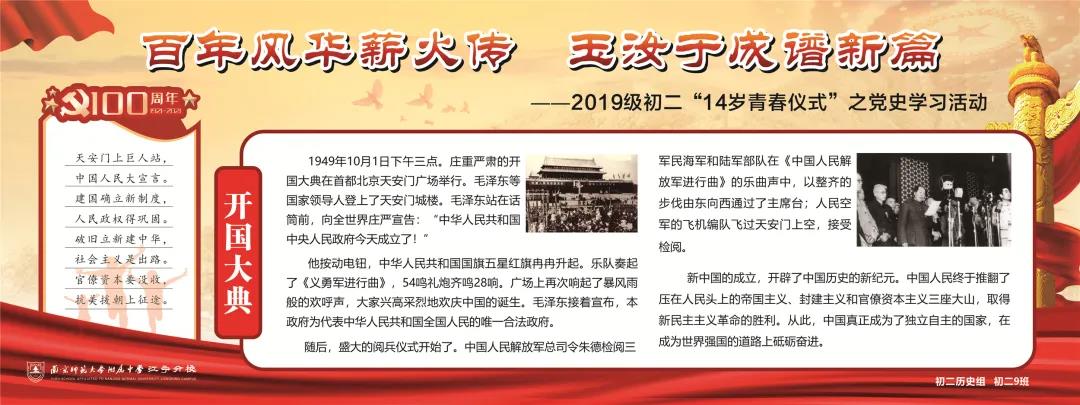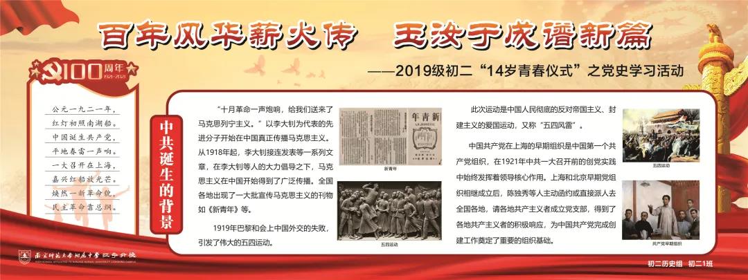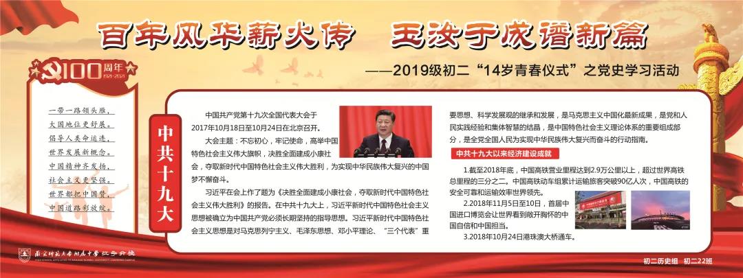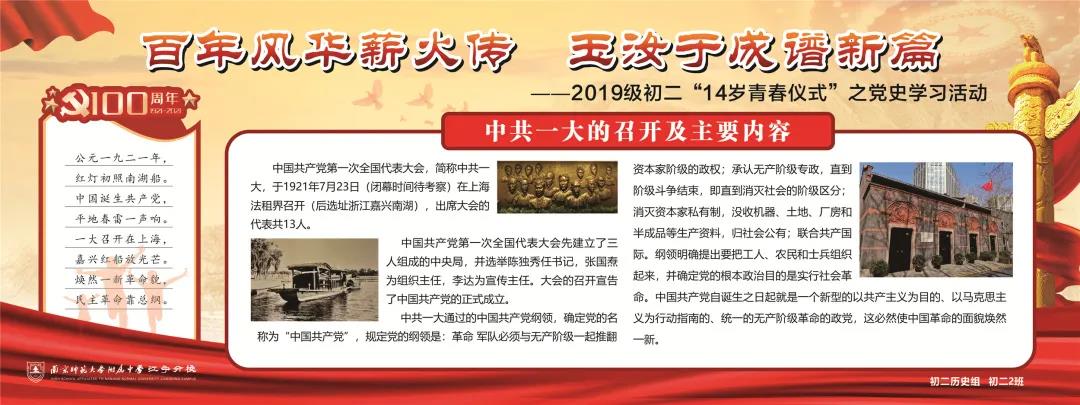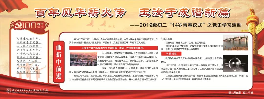 本次活动由初二历史组牵头。每个班根据给定主题甄选材料、反复修改,最终呈现出二十二幅党史学习展板。