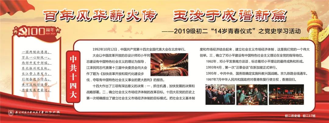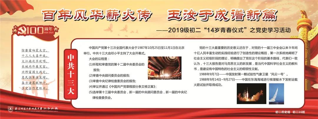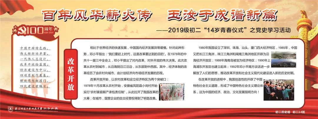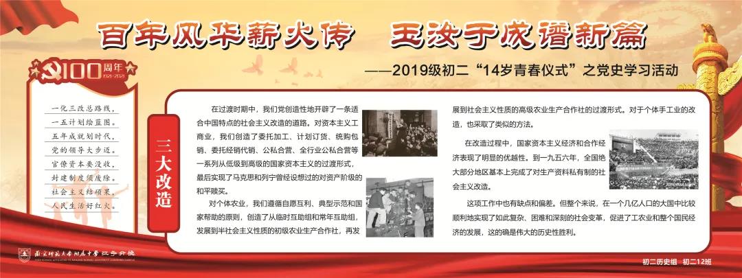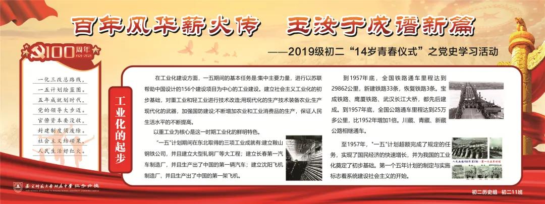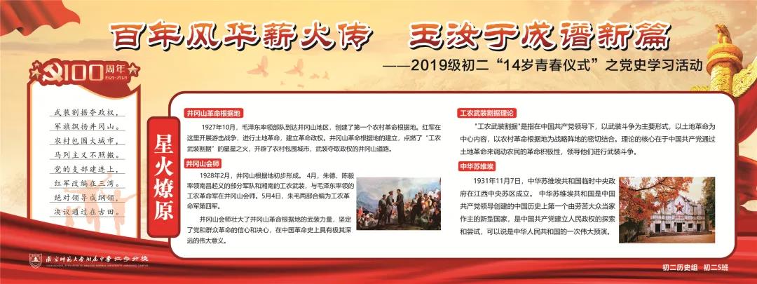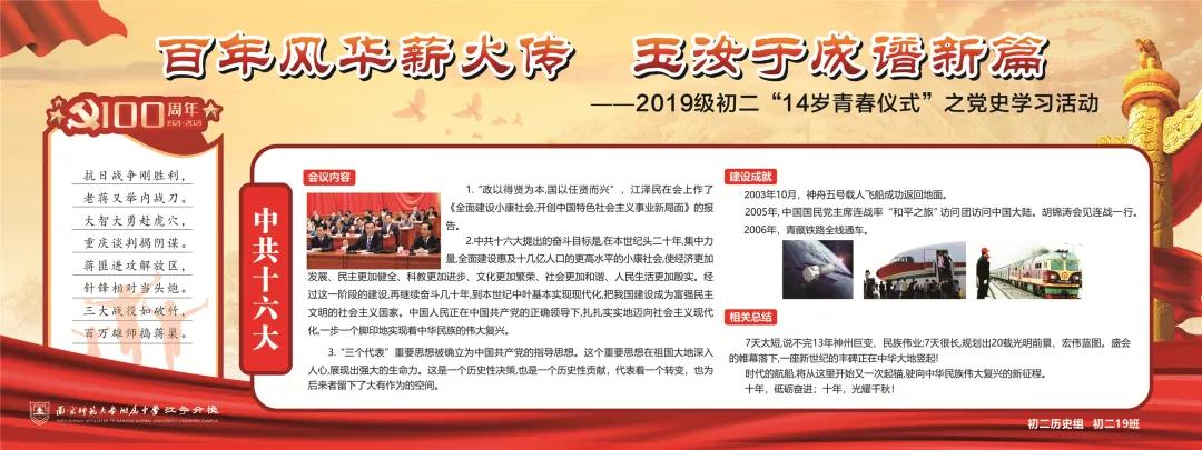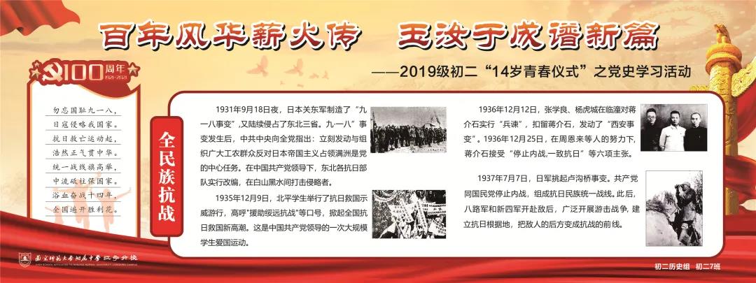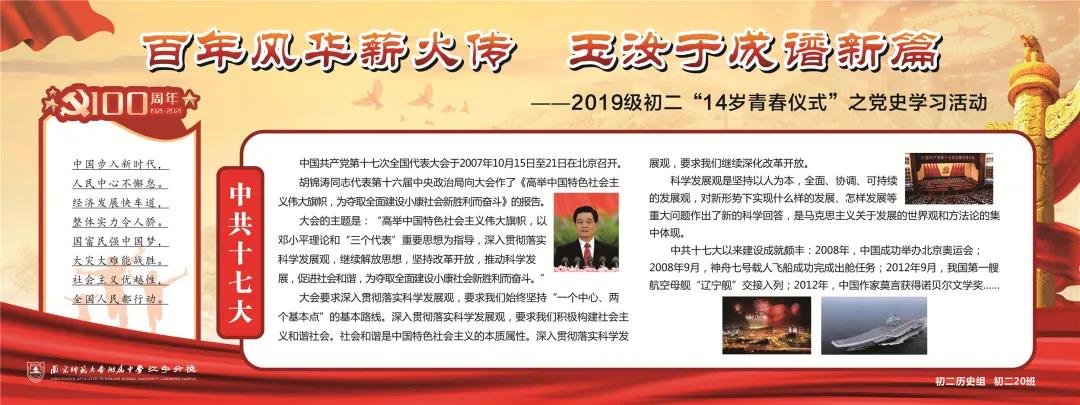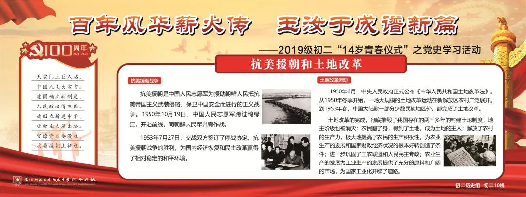 本次活动由初二历史组牵头。每个班根据给定主题甄选材料、反复修改,最终呈现出二十二幅党史学习展板。
