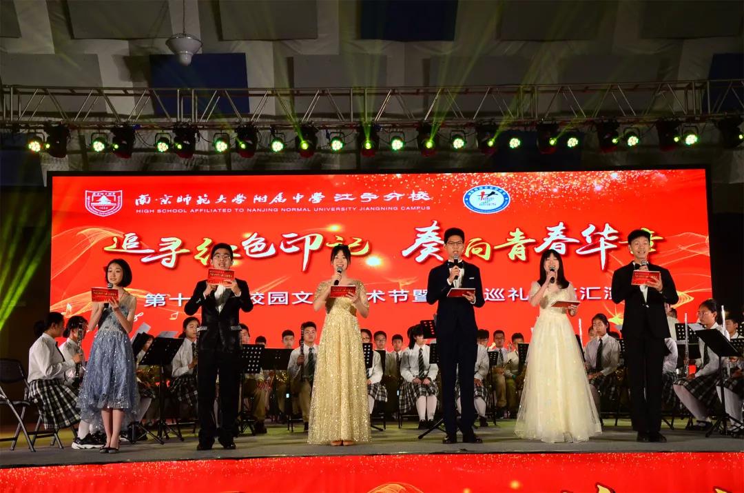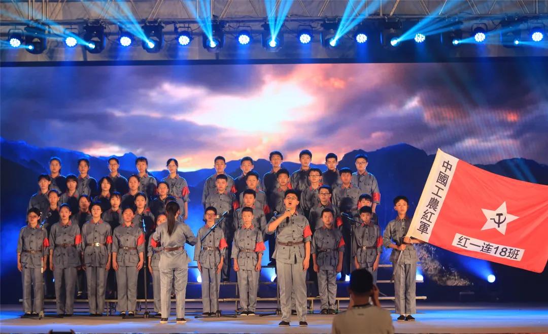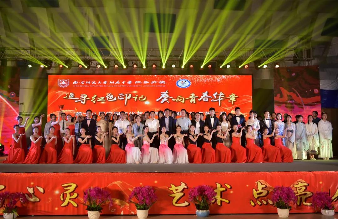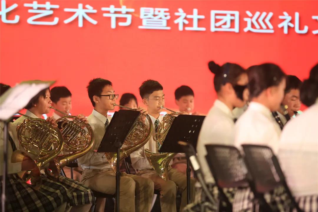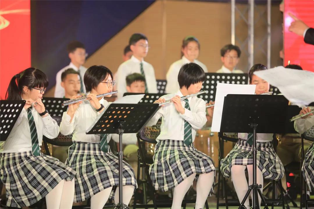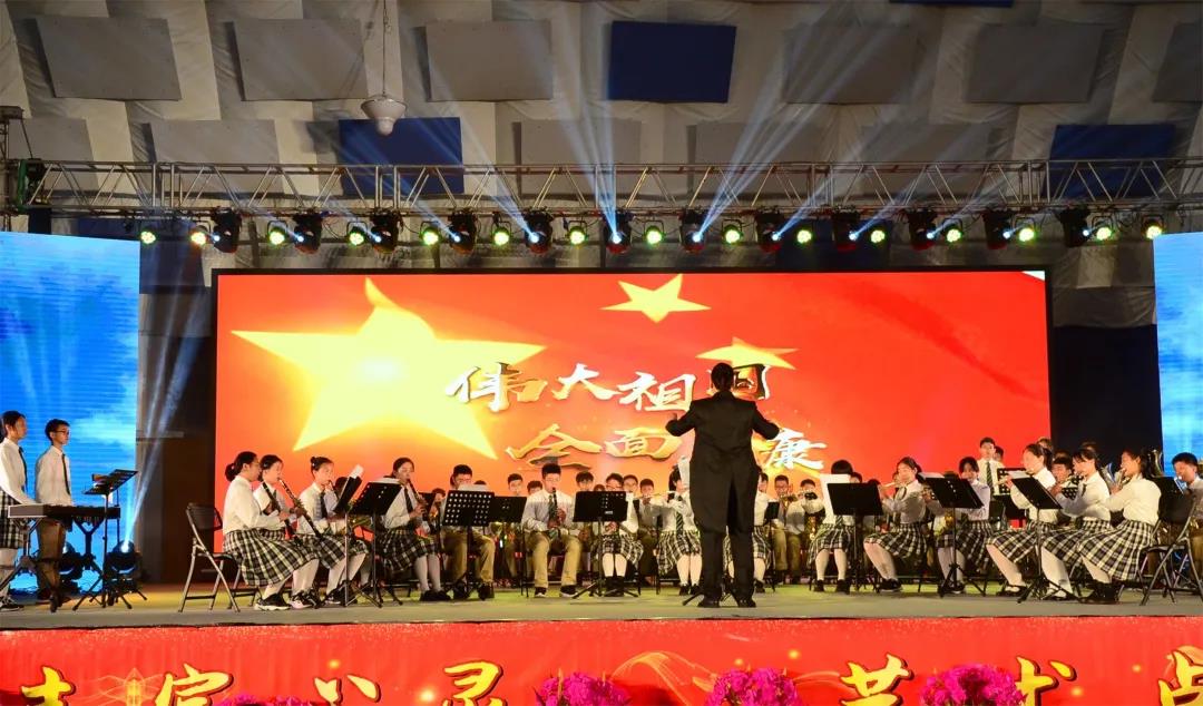 演出在管乐团《我的祖国》大气磅礴的乐声中拉开帷幕,之后,舞蹈、古琴、啦啦操、朗诵、合唱等形式多样的节目相继登场。“飞舞”舞蹈团美丽的姑娘们裙似飞鸾、袖如回雪,裙袖舞动、飘摇曳曳,以柔美的舞姿表现出中国民族舞、古典舞之美; “尚颂”合唱团的同学们以动听的歌声,唱出烟雨朦胧中的江南春色之美;高二年级同学选择了爱国主题的古今诗词代表篇章,深情朗诵,展现出中国的诗词之美;古琴社师生以一曲《秋风词》,将大家带入秋风清秋月明的意境中,奏出了中国琴曲的意境之美;初一(18)班同学们带来的《长征组歌·四渡赤水出奇兵》,以嘹亮的歌声赞颂红军战士们的钢铁意志;高一、高二年级同学表演的现代舞,动感十足,展现出现代中学生的青春活力;校园十佳歌手代表以歌曲《灯火里的中国》,送上对祖国母亲最美的赞颂与祝福;小学部舞蹈团的舞蹈《追月·逐梦》和啦啦操队的《星光闪耀》,赢得全场师生的阵阵掌声;初、高中党员教师代表和幼儿园教师代表表演的音舞诗《追寻红色印记》将现场气氛推到最高潮。