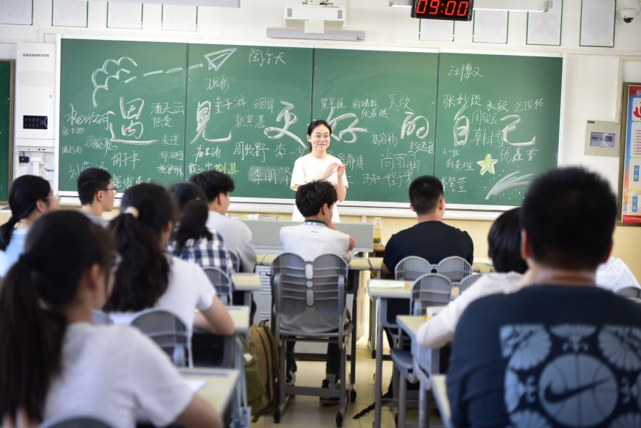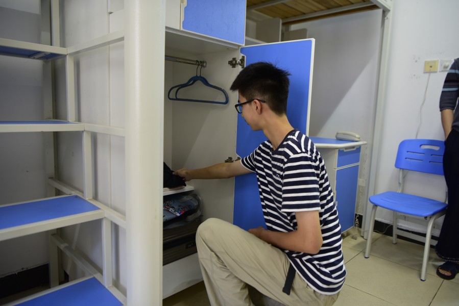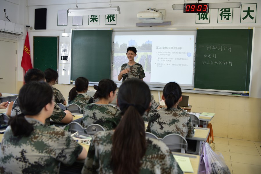 整理完自己的宿舍之后,新同学们马不停蹄赶往圆形广场边上的环形走廊领取自己的新军训服,随后前往自己的班级和新同学、新老师见面。教室里,大家自我介绍,互相认识,气氛逐渐热络起来。班主任为大家强调军训期间的纪律,“服从命令听指挥”“掉皮掉肉不掉队””流血流汗不流泪“,让同学们开始意识到军训不只是肉体上的磨练,更是对心智的一次锤炼。