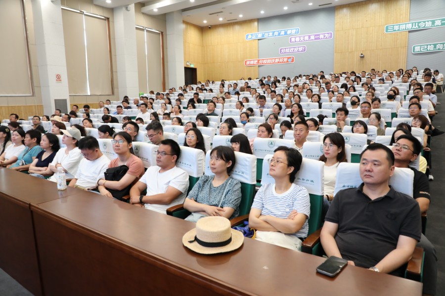 同一时间,家长们也在报告厅聆听属于家长的“开学第一课“。新生家长会由高中部副主任移燕老师主持,副校长、高中部校长周天航老师首先发言。周校长从关注孩子身心,发展学生成绩;面对高中阶段转型阵痛和学科挑战的过度方法;家校协同共育,打牢学生成长基础三个方面展开,希望孩子们都能变成一个专业的学习者,强调过程要美丽,结果也要灿烂。