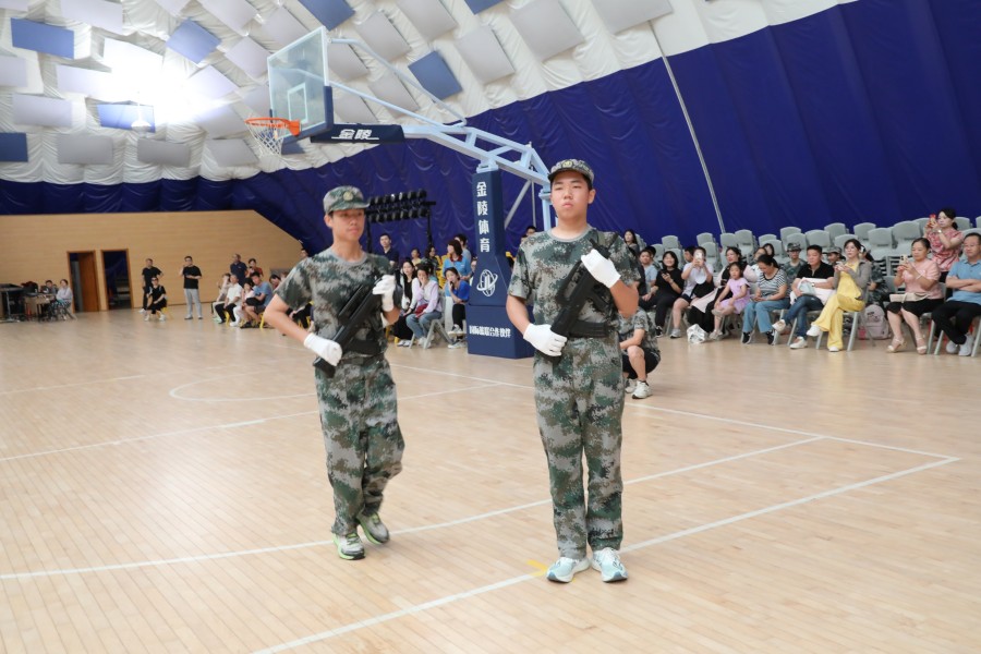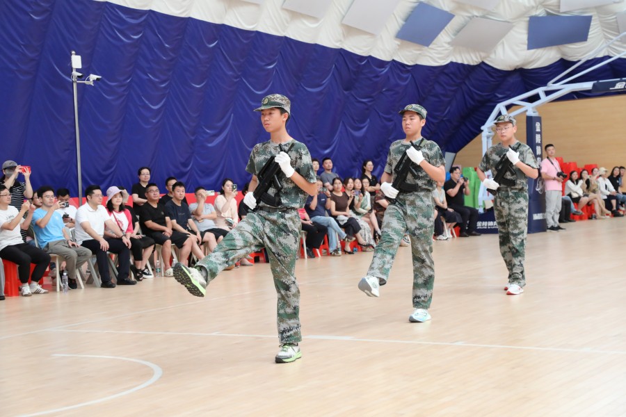 【分列式】在军训团总教官昂扬的口令中,军训总结正式开始。四名标兵以标准的动作精准就位,校旗在旗手护卫下庄严入场。同学们迈着铿锵的步伐,眼神坚定地注视着前方,十个连队依次正步通过主席台。主席台上的领导、老师们频频点头,投出赞许和肯定的目光,观看的家长们举起手机记录下这成长的瞬间,踏步声与掌声随着连队的行进此起彼伏,与队伍中“一二一”的口令声交织成一曲激昂的青春乐章。