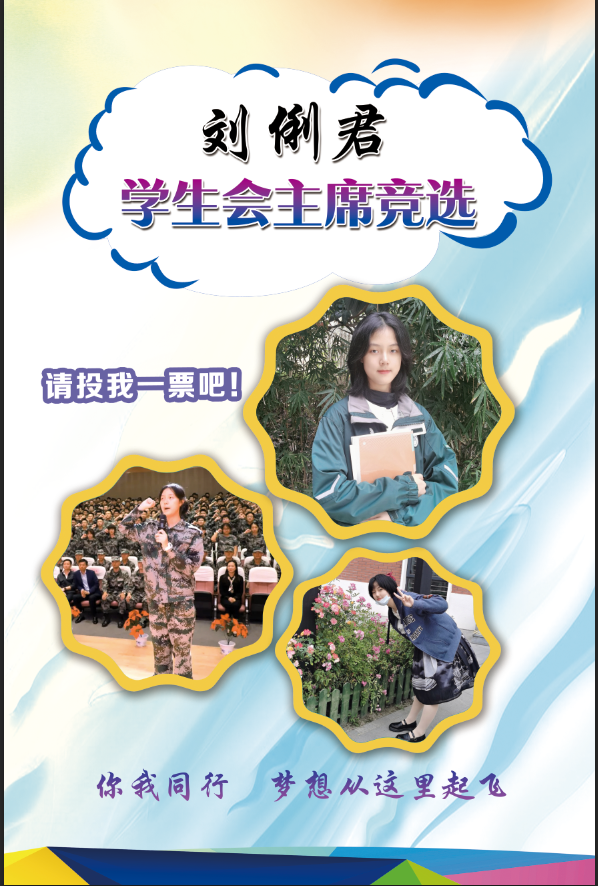 竞选宣言:“我们都是追梦人,千山万水,奔向天地跑道。”生逢盛世,肩负重任,愿为祖国不懈奋斗,愿为学校做出贡献,请大家支持我,谢谢!