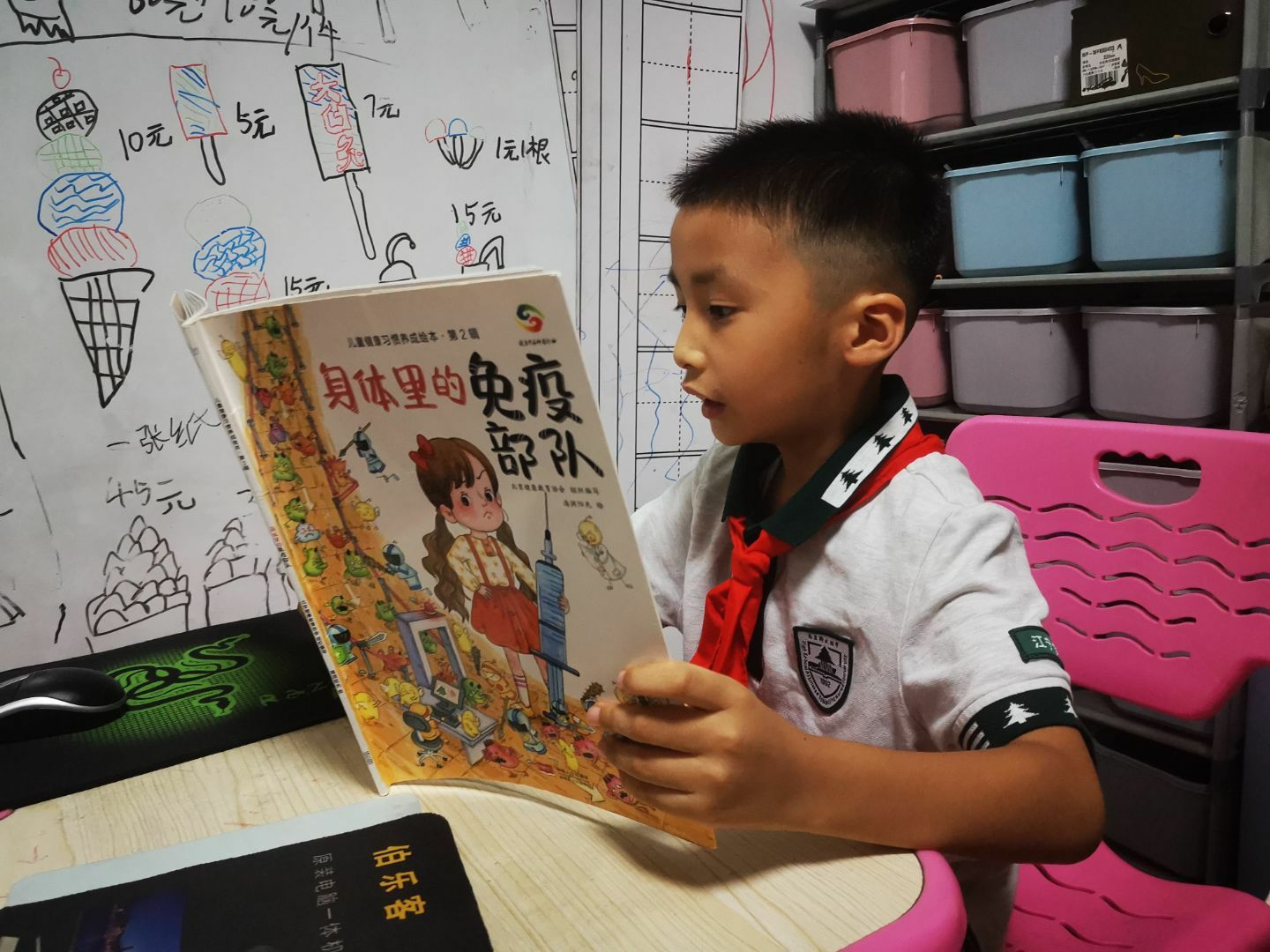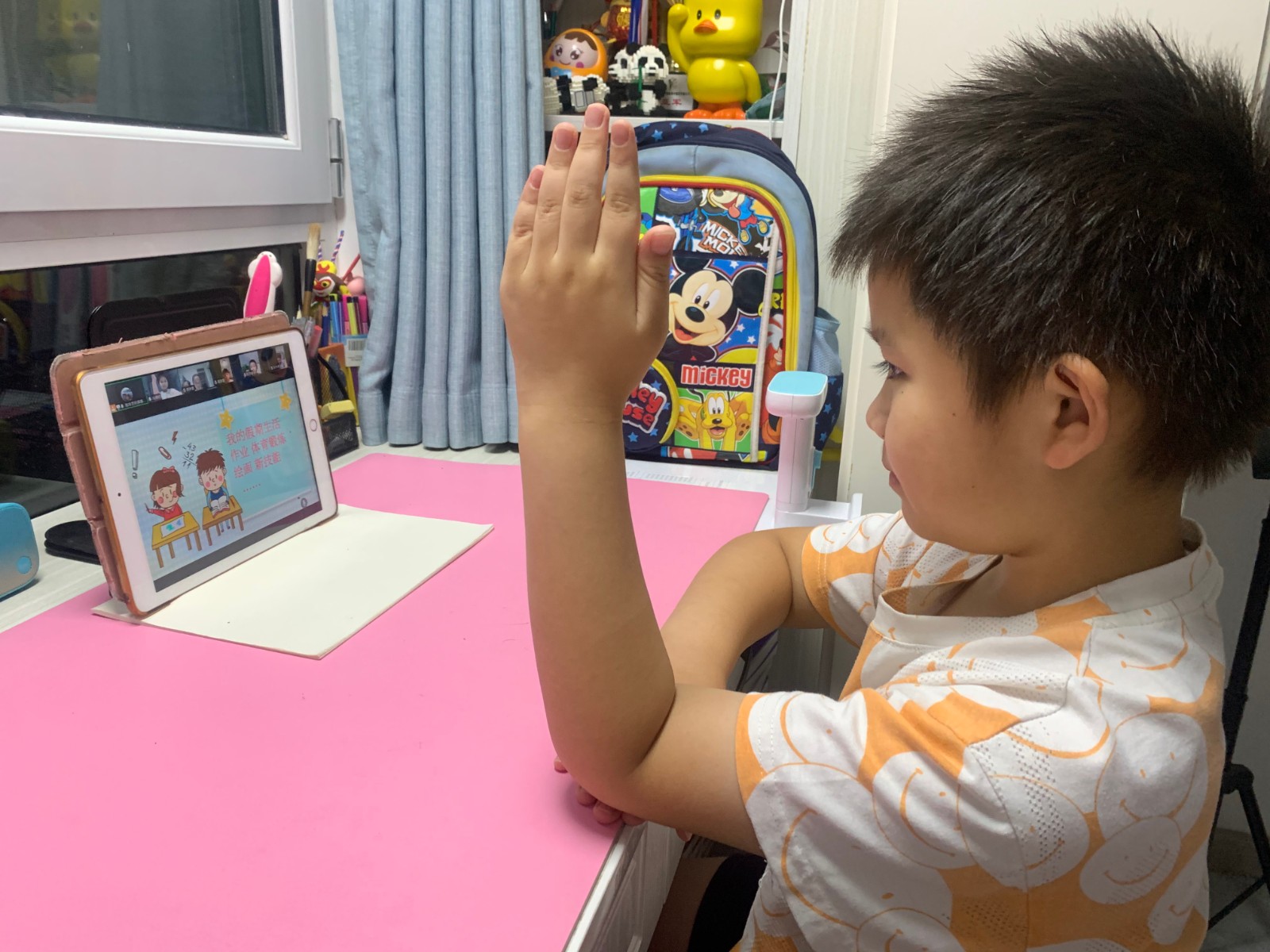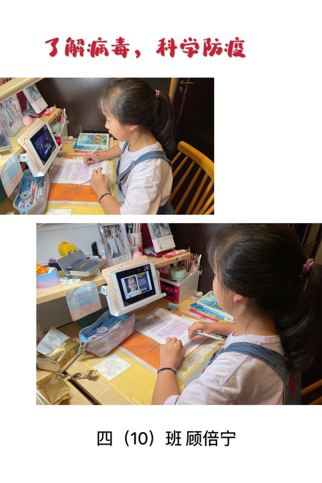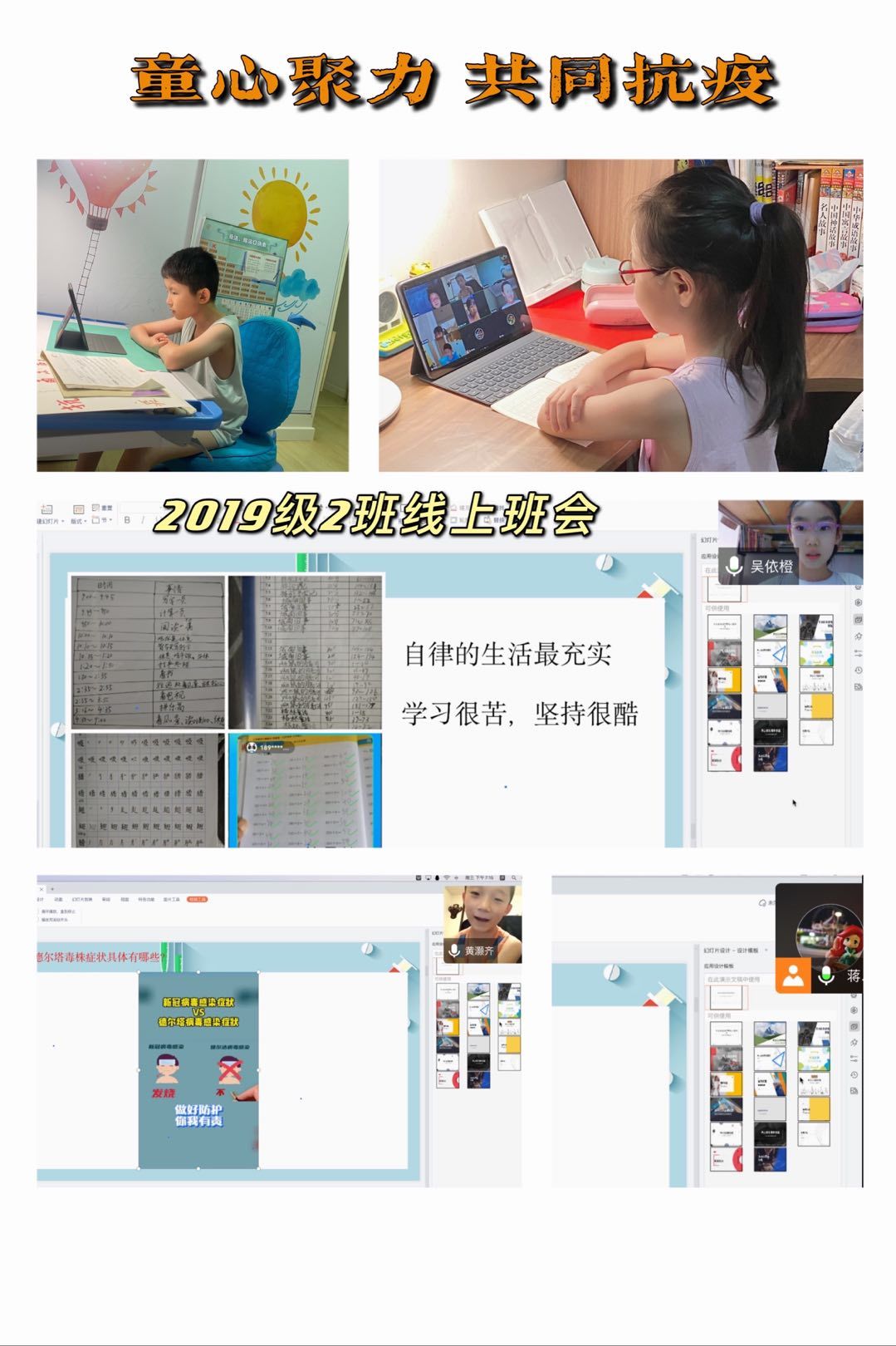 小学部在为学生提供居家生活指导,心理防疫自助指南的基础上,利用 “云班会”组织学生交流对德尔塔病毒的认识和居家隔离感受,教师指导学生运用科学方法疏导情绪,师生分享医护人员、志愿者在抗疫活动中的先进事迹,帮助学生树立起 “年少有为,迎难而上”的信心,自觉按照作息时间表规律学习、生活,关注时政新闻,积极参加体育锻炼,主动承担家务劳动。同学们以绘画、演讲、剪纸等多种方式表达了抗疫决心。