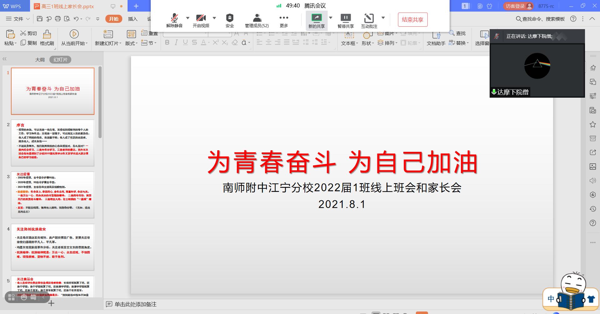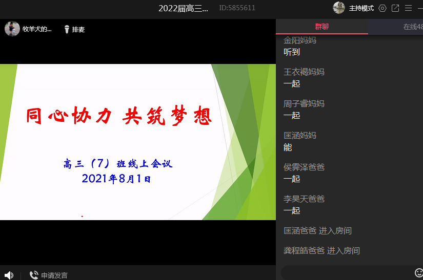 高中部及国际部各班级开展线上云班会及家长会,对学生的暑假学习生活进行具体指导。利用线上家长会,成功搭建起家校合作的平台。本次班会各班级班主任对当前疫情防控提出具体要求,引导家长科学认识疫情,增强防范意识,鼓励学生将抗疫中展现出来的担当精神投入到高中的学习生活中去,保持良好平和心态,提升居家学习效果。