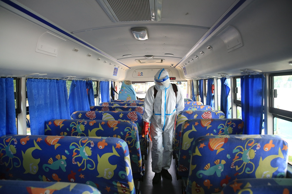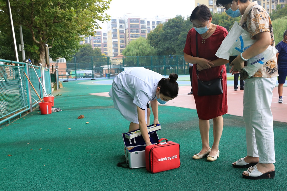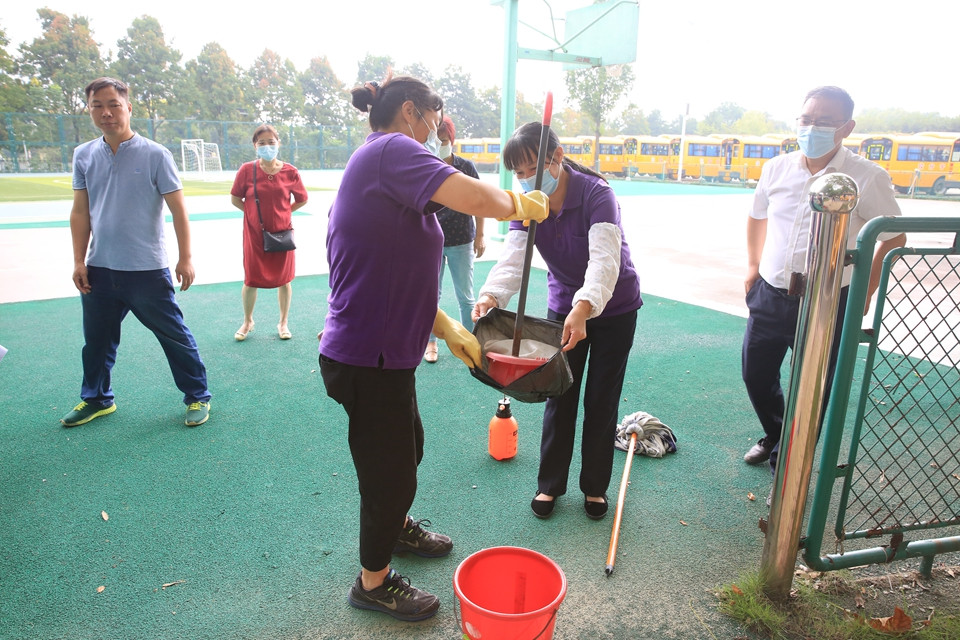 第二场是校车上突发公共卫生事件应急处理演练。一演员学生在校车上呕吐发烧,接送老师立即通知驾驶员靠边停车,用呕吐物专用处理布覆盖呕吐物,同时疏散学生到路边安全地带,排好队清点学生,通知生病学生家长把学生接回送医,然后驾驶员和接送老师分别向车队和学校汇报情况,学校和车队立即启动应急预案,另派校车前往出事地点把学生送往目的地。当事车辆到校后,由专业消杀人员对呕吐物进行清理、打扫车厢、进行消杀。校医对随车人员进行初步检查,确定安全后进教室,有疑问的进行隔离、送医。第二场突发公共卫生安全事故应急演练到此结束。