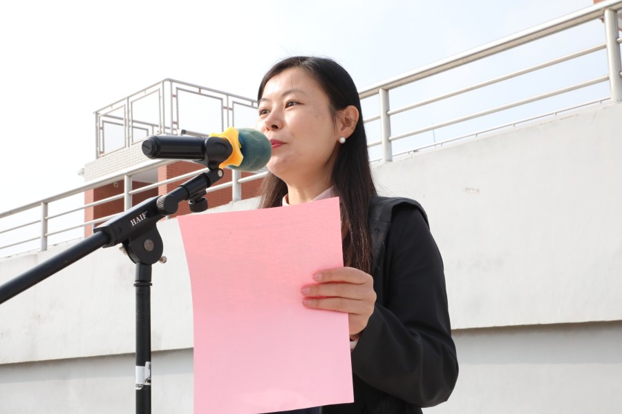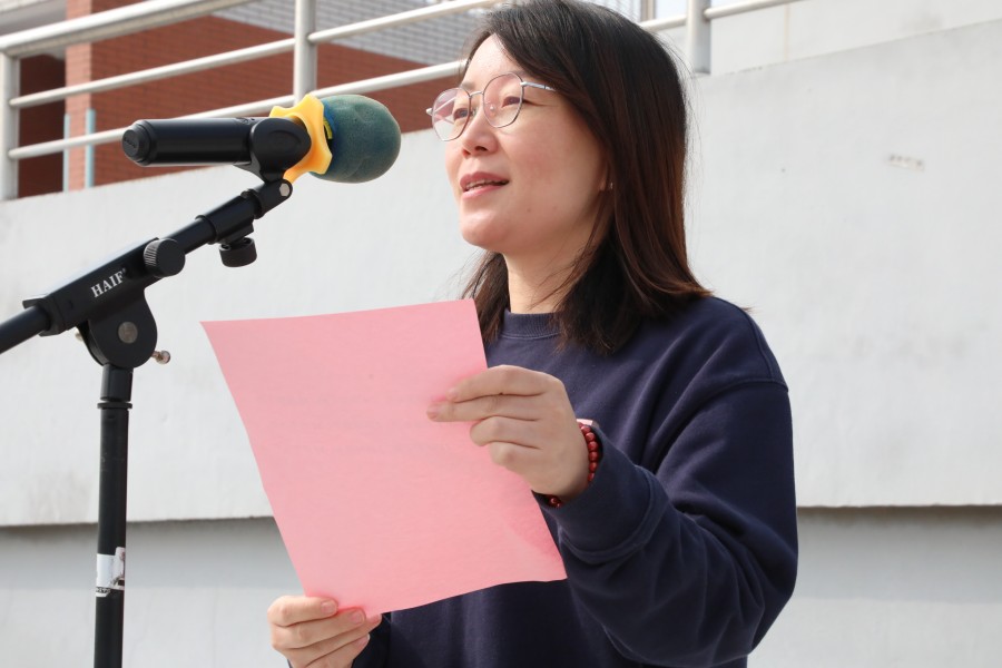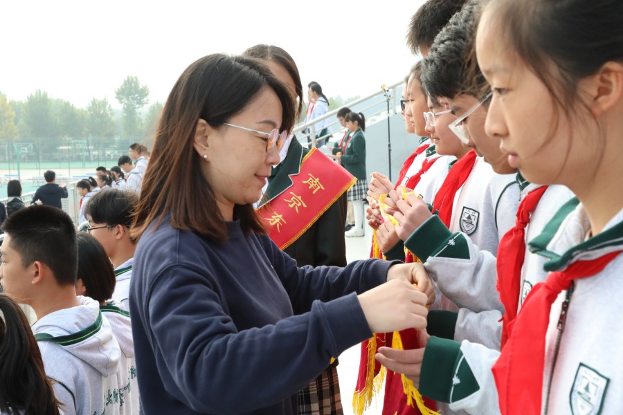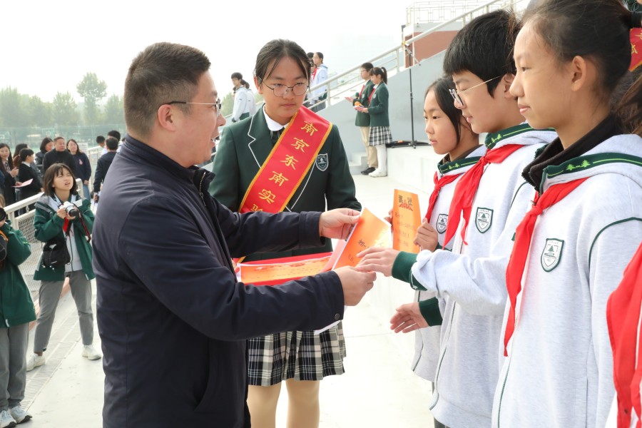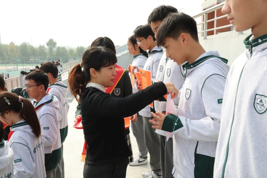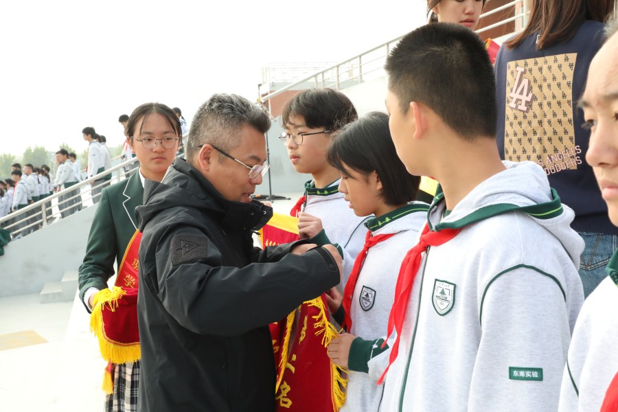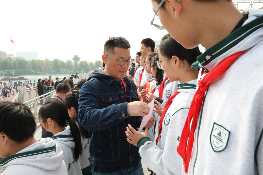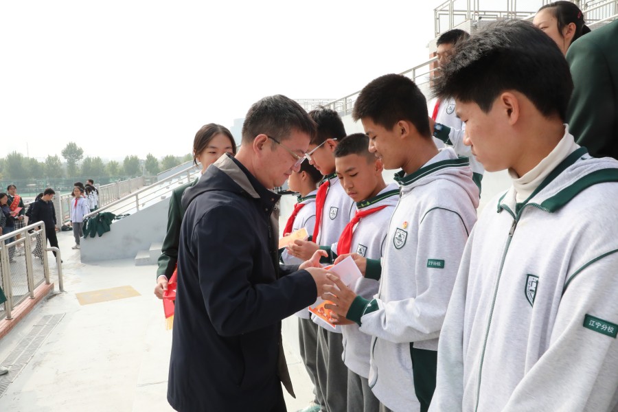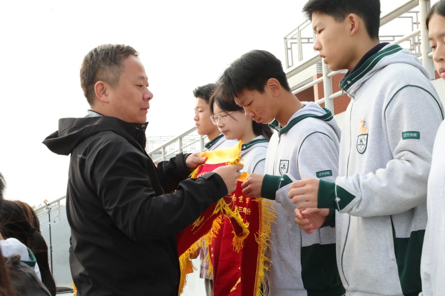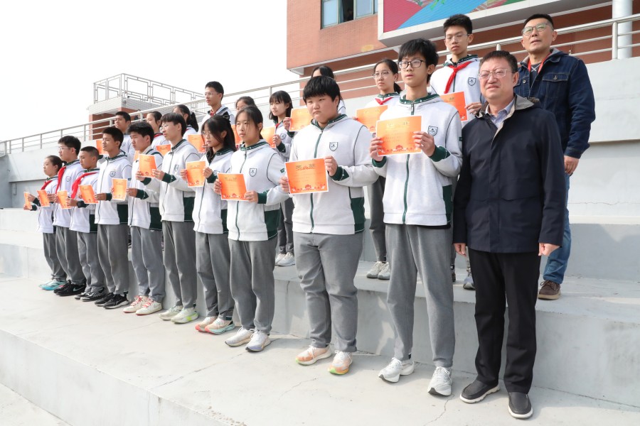 除了集体荣誉,个人的突破同样值得喝彩。学生发展中心主任高博老师上台,宣读本次运动会中打破学校纪录的学生名单,每一个名字背后,都是一段关于坚持与超越的故事。随后,副校长、初中部校长石爱平老师,副校长、后勤保障中心主任纪湘元老师为这些 “纪录挑战者” 颁奖。