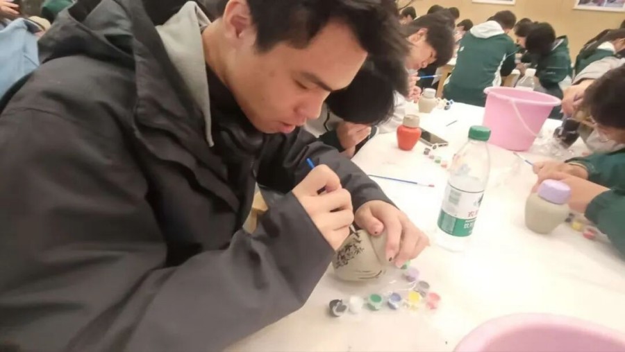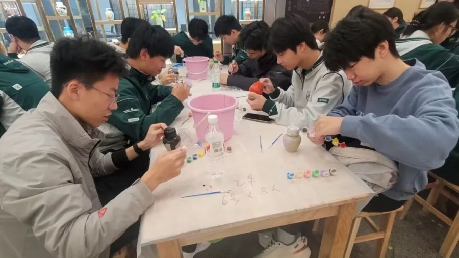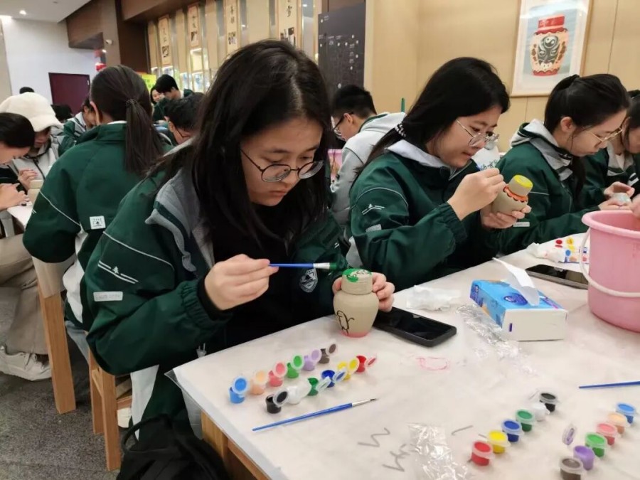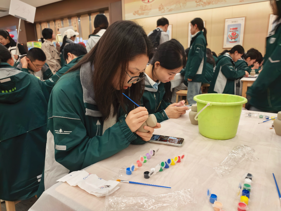 黄酒博物馆的檐角垂着时光,空气里浮动的陈香,是浙地千年酿造史的余韵。那坛静置的97年“活酒”最是动人,琥珀色酒液在光下泛着温润光泽,不仅封存着近百年的日月精华,更藏着古法酿造的处世哲学——需兑低度酒方能饮用,恰是古人“过犹不及、中庸守度”的智慧具象,是匠人们对自然节律与酿造分寸的世代敬畏。 我们围案而坐,为素白酒瓶赋予生命。笔尖落下,有人以淡墨绘绍兴乌篷穿梭桥影,复刻水乡与酒的共生;有人以朱红题“曲水流觞”诗句,追溯黄酒与文人雅集的渊源。 当指尖摩挲过未干的墨迹,当耳畔回荡着同窗的笑语,忽然懂得:传承从不是被动的复刻,而是主动的承接——是让千年匠心在少年指尖流转,让古人智慧在同辈互动中苏醒,让这份沉淀在时光里的文化遗产,以温柔而鲜活的方式,在新一代的生命里生生不息,绵延不绝。