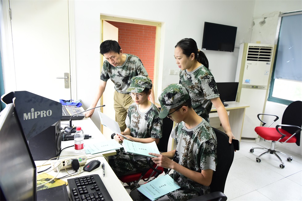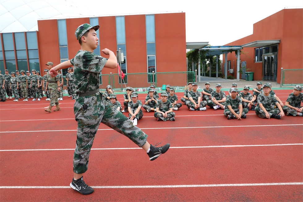 讲座之后,仍然是队列训练。不过,下午的温度升高了,训练难度也增加了,开始练习正步走。“摆臂齐胸”“脚尖绷直”“踢出去”“用力下压”,每一个动作都要用力、用力,不一会儿,同学们已是大汗淋漓。有的同学体会不到要领,趁休息的功夫自己练习,已经会了的往往在旁边热心指导,“兵教兵”的效果还不错。有些连已经走得有模有样了,听那衣服摩擦的声音,脚步落地的声音,整齐而有力,让人不禁赞叹这帮孩子真是聪明且刻苦。教官们分明也为自己的教导有方感到自豪,上午拉歌还有点扭捏,下午教唱军歌时就大大方方开嗓了。